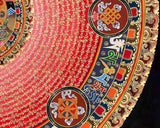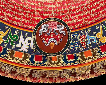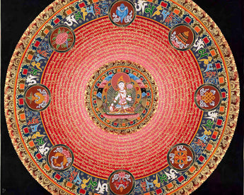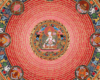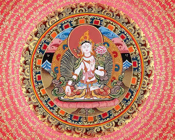 White Tara is shown in the thangka's center in a pose that is both graceful and kind. She is radiantly dressed in white robes that represent her transcending purity and knowledge. The tranquil smile on her face, which reflects her limitless compassion and maternal presence, is expertly captured by the artist. The mandala, which wraps around White Tara, is a complex composition of mantras, sacred geometric designs, and symbolic elements. These components blend in perfect harmony to produce a potent visual representation of the healing energies and transformative properties connected to White Tara's mantra.