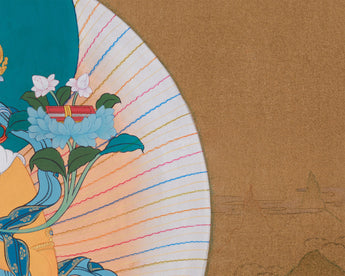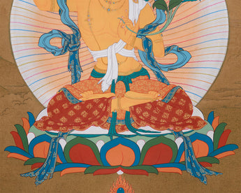 The Wisdom Buddha Manjushree, a revered Bodhisattva in Tibetan Buddhism, is depicted in this Thangka, embodying the clarity of thought and profound insight required for spiritual awakening. His presence aids practitioners in their spiritual practice, promoting wisdom and compassion.