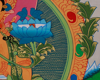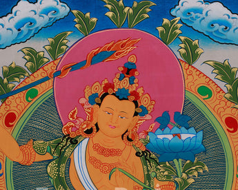 This Wisdom Deity, Manjushri Artwork, depicts the Bodhisattva of Wisdom, one of the most revered figures in Mahayana Buddhism. This Thangka was hand-painted by a skilled Nepali artist in the traditional style, showcasing remarkable attention to detail. The artwork is created on durable, textured cotton canvas, enhancing the colors' brilliance. Rich acrylic colors are applied to bring the intricate design to life with vibrant, long-lasting hues. Genuine 24K gold in the painting imparts a bright, spiritual quality that enhances key elements and its overall appearance. These materials make this Thangka a lovely spiritual piece and high-quality art.