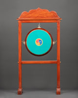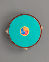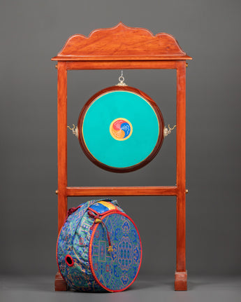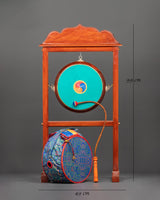 The drum is depicted with a wave-like symbol at its core, surrounded by detailed and brilliant colors. The drum is suspended from three sides and attached to a stand with a base. The top of the stand is embellished with a roof-like carving, which adds decorative detail to the construction. The drum is played with a beautiful curved design stick and a well-crafted handle for a secure grip. The drum cover cloth is elegantly designed with religious mandala-like arts, which lend spiritual and artistic value to the piece. The entire design mixes artistic attractiveness.