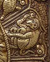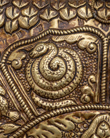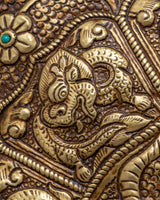 A metal thangka is a type of thangka painting that is made on a metal surface rather than on traditional canvas or paper. Metal thangkas are often made using copper, brass, or silver and are usually decorated with intricate designs and Buddhist iconography using a technique called repoussé. This involves hammering the metal from the reverse side to create a raised relief image on the front. Metal thangkas are known for their durability and are often used in ritual contexts or as decorative pieces in Buddhist homes and temples. They are particularly common in Tibet, where they have been produced for centuries.