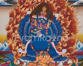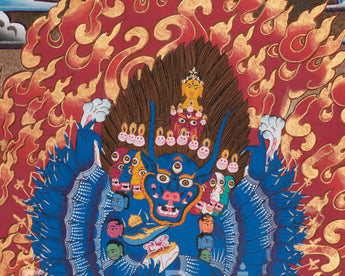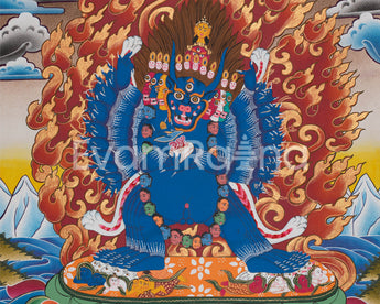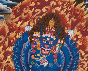 Yamantaka, also known as Vajrabhairava, is a wrathful deity in Tibetan Buddhism and is revered as a powerful yidam (meditational deity). As the "Destroyer of the Lord of Death," Yamantaka embodies the forceful aspect of wisdom and compassion, aimed at overcoming death, ignorance, and delusion. His fearsome appearance, with multiple heads, arms, and legs, is not a sign of malevolence but a representation of his ability to conquer evil and protect practitioners from obstacles on their spiritual path.