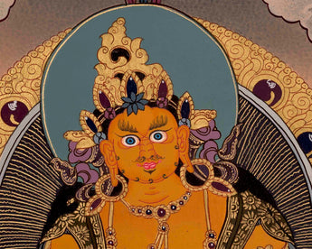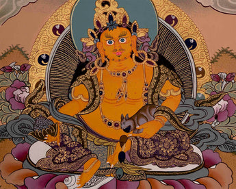 Yellow Dzambala Thangka paintings depict the deity of wealth and prosperity. The central figure is a robust, regal deity with a plump appearance, symbolizing abundance. He is seated in a royal posture, exuding authority and readiness to bestow wealth. Dzambala is adorned with an ornate jeweled crown and intricate jewelry, highlighting his connection to opulence. In his right hand, he holds a jewel-spouting mongoose, symbolizing wealth and abundance. In his left hand, he holds a citron or a bowl filled with jewels, representing the fulfillment of wishes and wealth. The background includes auspicious symbols like lotus flowers, symbolizing purity and enlightenment. The thangka's vivid colors and gold highlights enhance its divine and opulent aura. The meticulous detailing and balanced composition further enhance its aesthetic and spiritual appeal. Yellow Dzambala Thangka paintings serve as devotional tools for meditation and rituals aimed at attracting wealth and removing financial obstacles. They are also revered for their artistic beauty and displayed in homes, temples, and monasteries as both sacred and decorative objects.