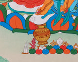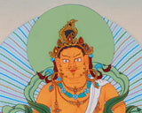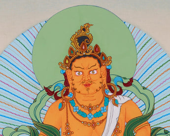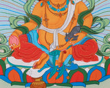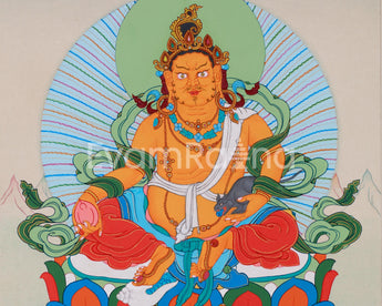 The Wealth Deity Thangka, measuring 9 by 12 inches, features Yellow Dzambhala, who is revered as the deity of prosperity and abundance. He is depicted seated in a regal posture, exuding an aura of abundance and authority. He holds a mongoose spitting precious gemstones, symbolizing the endless flow of wealth and blessings in his left hand and a citron fruit in his right. The ornaments and robes, highlighted with 24K gold, add depth and brilliance to the piece, while the vibrant acrylic colors bring the deity's divine energy to life.