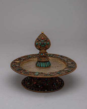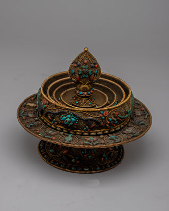 The word Mandala can be broken into two sections: maṇḍa implies the 'quintessence' or 'center and surroundings,' and la signifies 'grabbing hold of.’ It shows the natural balance of the outer world and the inner mind and can also be part of the daily preliminaries of meditation. It represents a combination of Buddha’s enlightened mind and body and is considered a great power. Mandala offering is a powerful custom practice in Tibetan Buddhism.