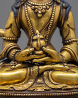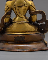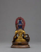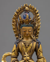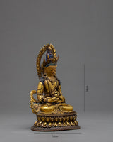 This statue art shows Amida also known as Amitayus Buddha in a seated posture magnificently. This statue is handcrafted in copper and gilded in 24K Gold. Buddhist Deity of Infinite Life is hand-carved in a serene face.
