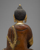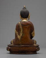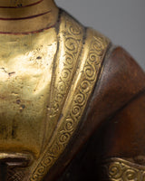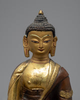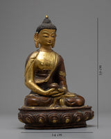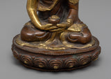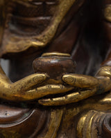 In this statue, Amitabha Buddha is depicted in exquisite detail. This work of Tibetan sculpture was made using copper and 24K gold. Huge and gorgeous extended earlobes signify a deliberate rejection of the physical world in favor of spiritual enlightenment. The entire Ushnisha over the artist's head, which represents Buddha's knowledge, was handcrafted.