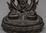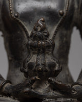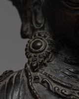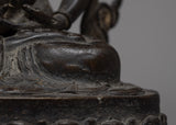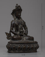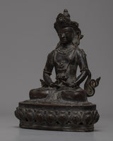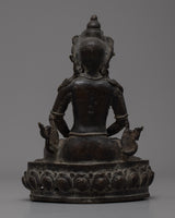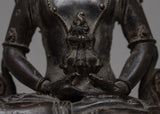 The Bodhisattva Amitayus Buddha Sculpture was handcrafted in Nepal in the traditional Himalayan manner. Amitayus is shown seated on a lotus disc, both hands holding a vase. Oxidized copper is used to form the body. For generations, the technique of creating such stunning sculptures has been passed down from generation to generation. We worked for months to create the god out of copper. Crafting the delicate decorations on the crown, in particular, needed considerable skill.