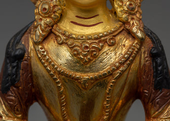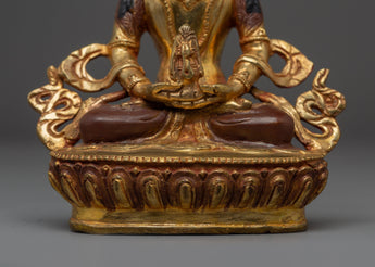 The Golden Statue of Amitayus tells a story of endless life and wisdom. Crowned with five points symbolizing the Five Dhyani Buddhas, Amitayus sits serenely in the vajrasana pose atop a lotus throne. His ushnisha shines as a mark of supreme insight, while his hands gently cradle a kalasha brimming with the nectar of immortality, held in a peaceful dhyana mudra. A swirling scarf dances around him, radiating compassionate energy, and his long earlobes whisper tales of deep listening and renunciation. Draped in bodhisattva jewels, this statue invites you to embrace longevity, compassion, and spiritual awakening.