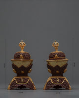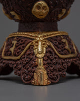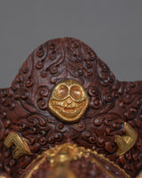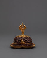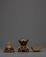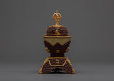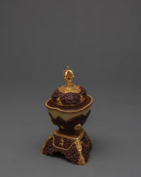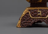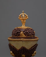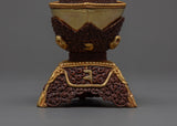 Our hand-carved kapala can be separated into three parts, i.e. the top bottom, and bowl. The top lid is beautifully carved and holds a vajra. Similarly, the middle is a gold-plated bowl that can easily be separated from the bottom. Likewise, the bottom is decorated beautifully to hold the overall set.