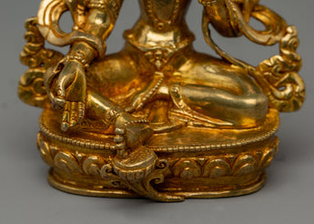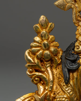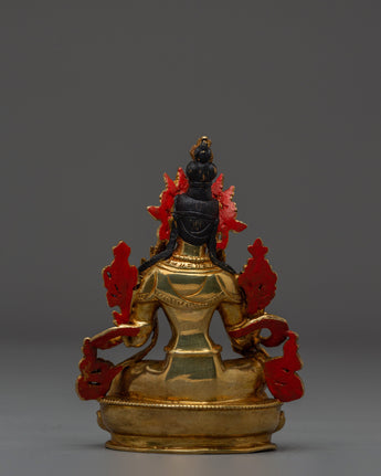 This Female Bodhisattva Green Tara Copper Handcrafted Statue stands 5.3” (13.5 cm) tall, with a base width of 3.9” (10 cm), and weighs 0.47 kg. Expertly crafted by skilled Nepalese artisans, this piece is made from copper with 24K gold gilding and features detailed gold and acrylic paintings. This delicate piece makes a meaningful addition to personal altars, meditation spaces, or as a symbol of compassion and protection in any spiritual collection.