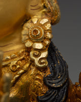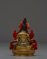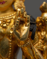 Green Tara, the swift liberator, shines as a beacon of compassionate action in Buddhist tradition. Imagine her gracefully seated on a blossoming lotus throne, one leg extended, poised to spring into action for those in need. In her hands, radiant lotus flowers symbolize purity and spiritual awakening. Her right hand displays the Varada Mudra, a gesture of generosity and fulfilled wishes, while her left forms the Three Jewel Mudra, paying homage to the Buddha, Dharma, and Sangha. Decorated with the five-pointed crown, she embodies enlightened wisdom, serving as a calm protector and guide for every seeker’s path.