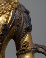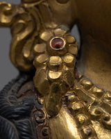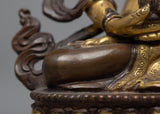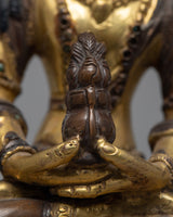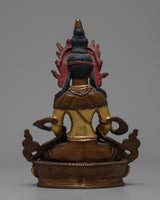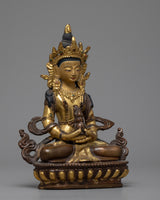 We hand-carved the Amitayus sculpture in pure copper, gilded in authentic 24k gold, and hand-painted with acrylic colors. We have portrayed a long-life god with a serene smile atop a moon disc lotus seat in this Tibetan art.