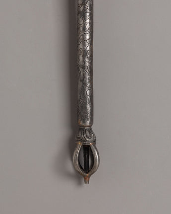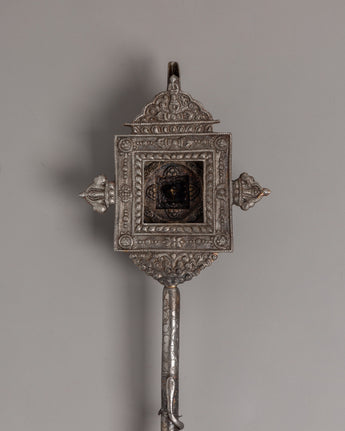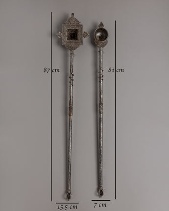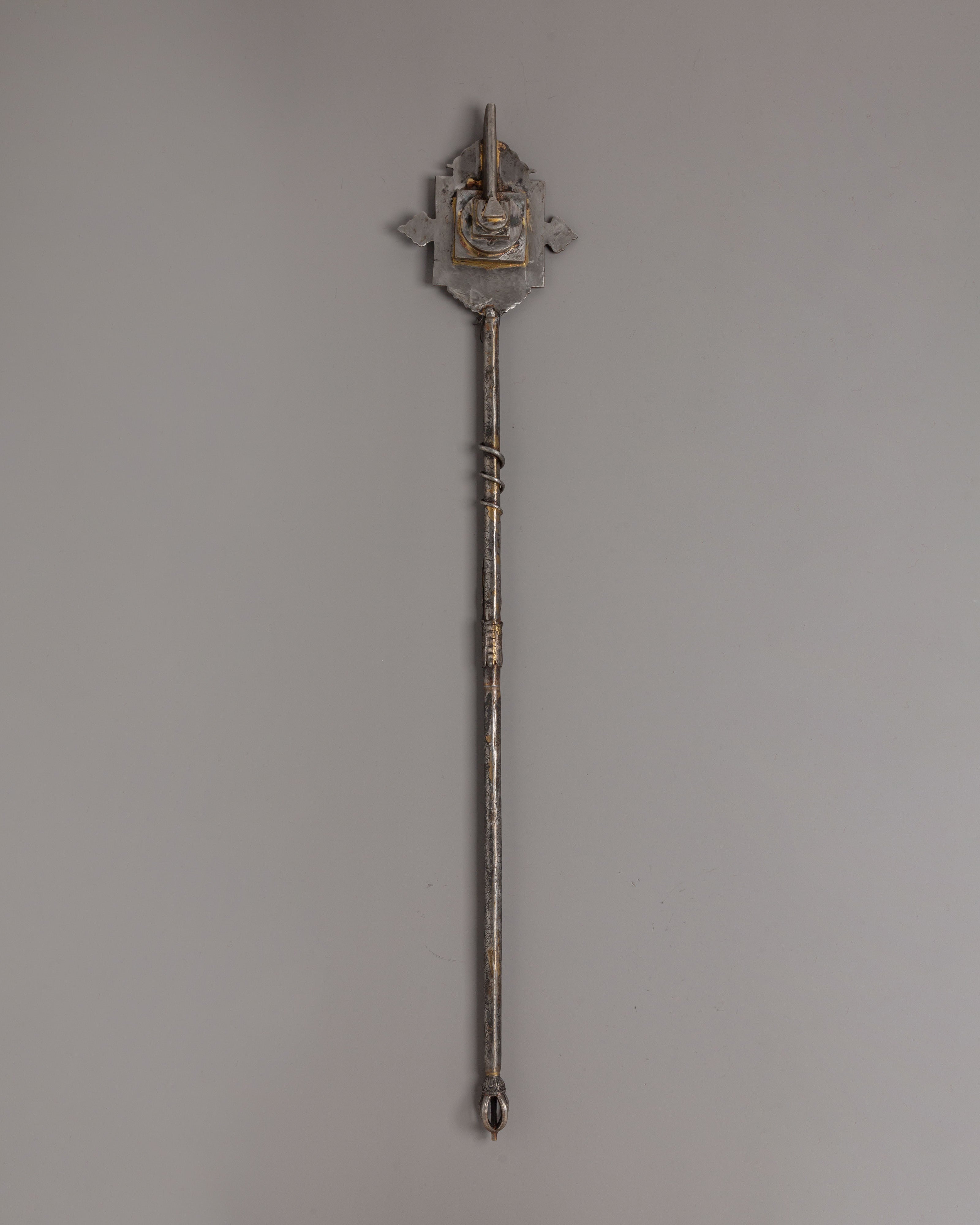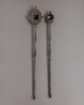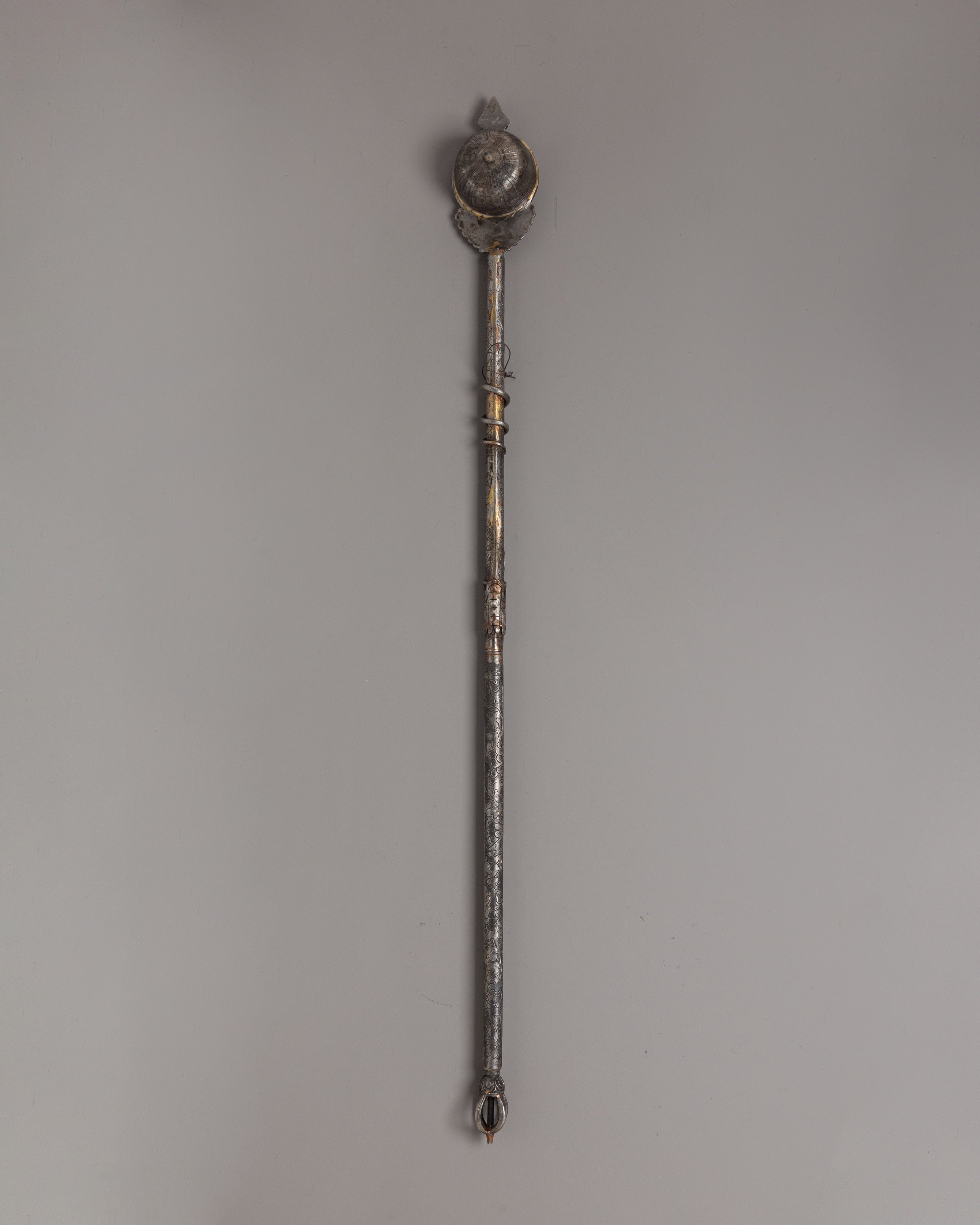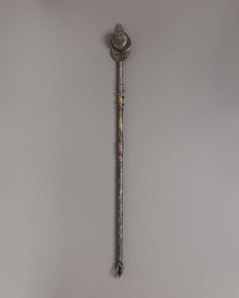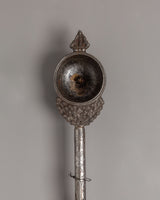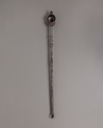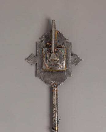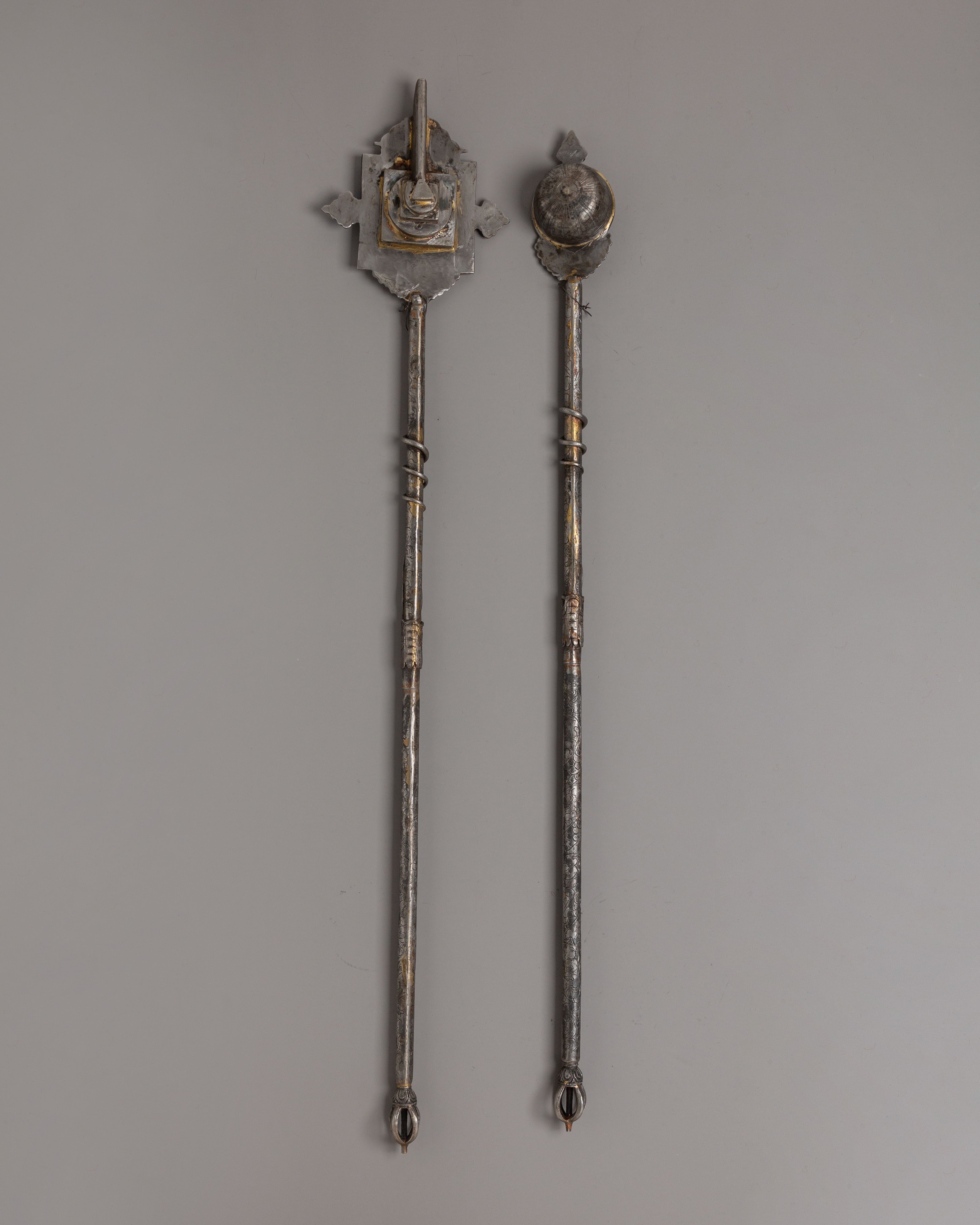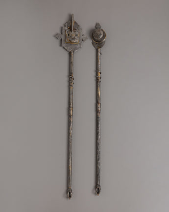 The Gangsa and Ganglus are extremely important ceremonial elements in Tibetan Buddhist culture. The Gangsa, with its round head, is frequently used to signify rhythm and sacred timing during pujas, symbolizing the cyclical aspect of existence and the Dharma's endless vibration. The Ganglus, with its more intricate head design, is used to magnify and balance the harmony of sound, frequently accompanying chanting, prayer recitations, or meditation offerings. Together, they make an ideal pair, representing duality and unity, wisdom and compassion, sound and silence. When hit or performed, the tones are thought to cleanse the surroundings, expel negative energy, and invoke divine benefits from enlightened beings.