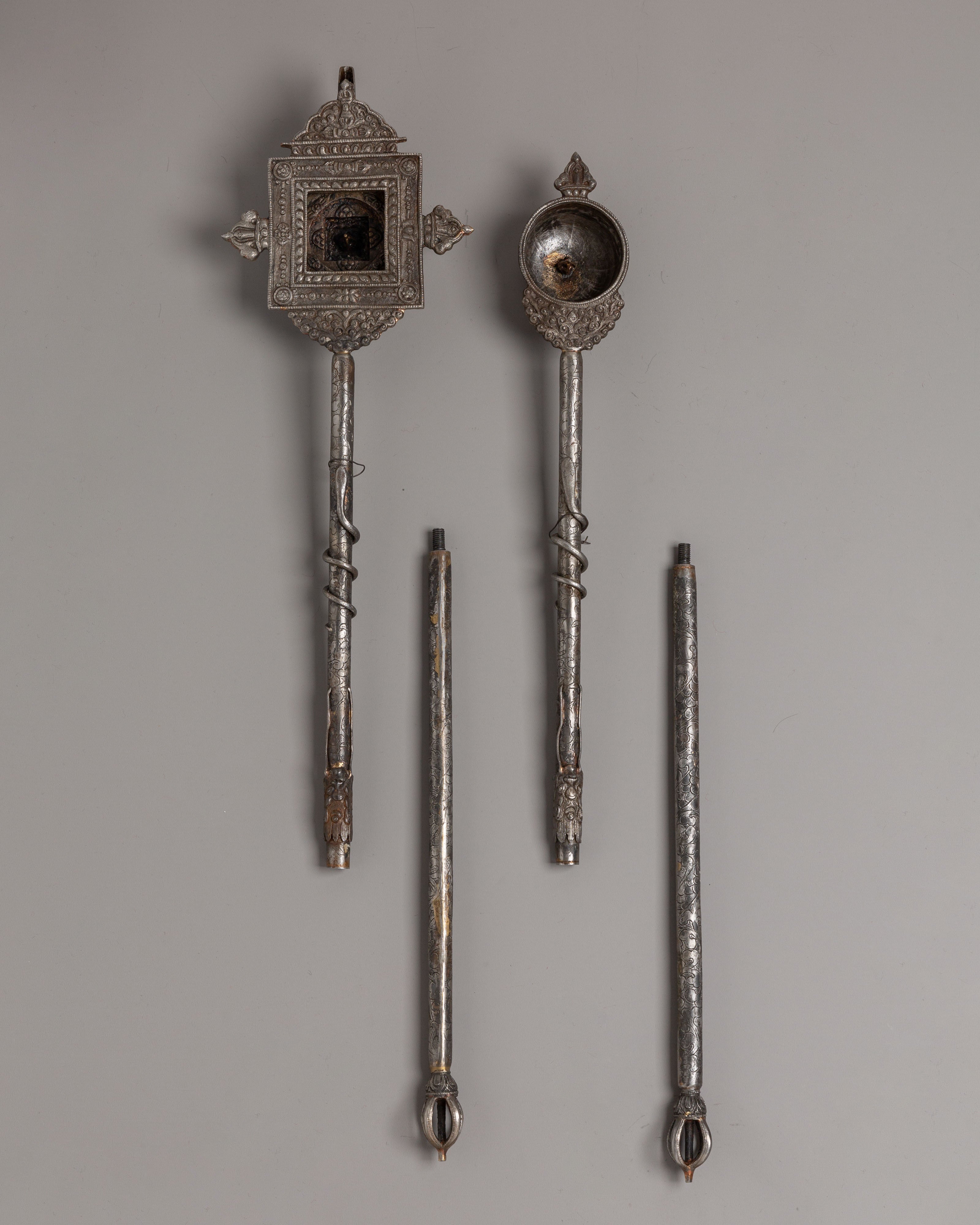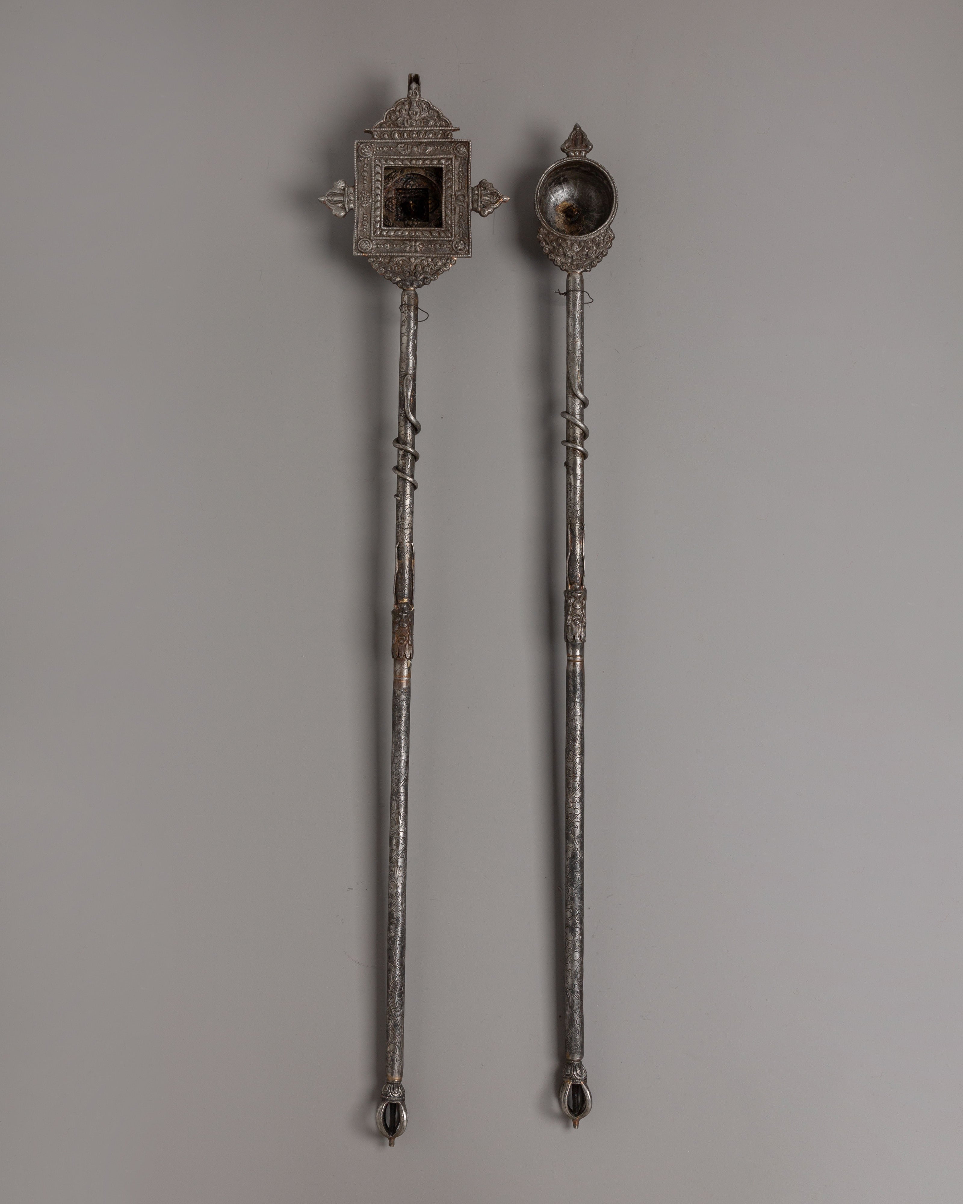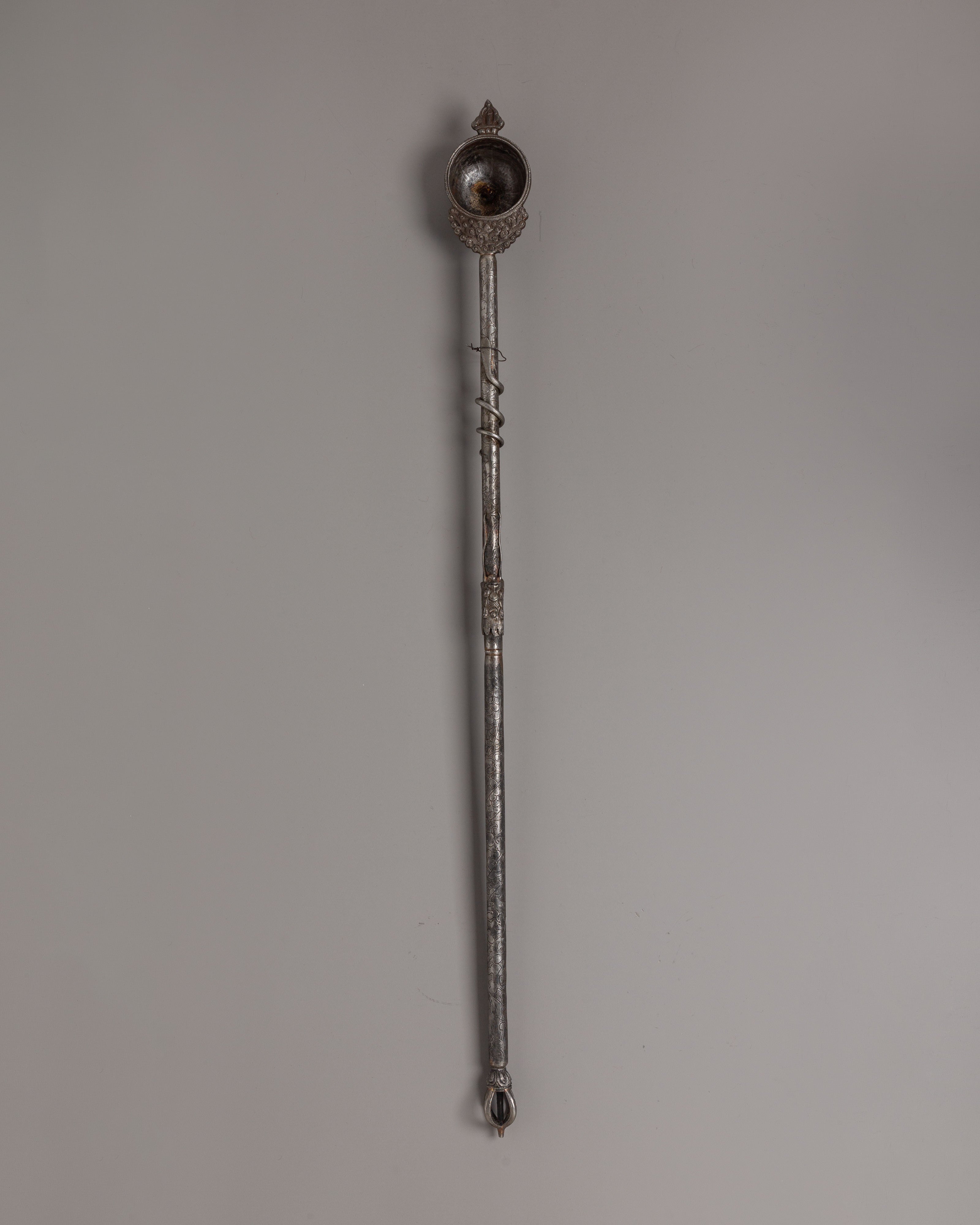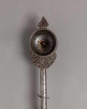 The Gangsa and Ganglu are traditional Tibetan fire offering spoons used in sacred rituals and ceremonies to present offerings like incense, ghee, or grains into a ritual fire. Crafted from copper, these tools symbolize devotion and purification, essential to Homa (fire puja) practices to invoke blessings and spiritual transformation.