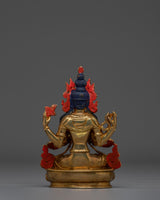 Chenrezig, a Tibetan Buddhist Art Piece, stands at 5.9 inches (15 cm) tall with a base measuring 3.9 inches (10 cm) and weighs 0.49 kilograms, making it a delicate yet sturdy piece. It features a copper body richly gilded with 24K gold, lending it a radiant and sacred glow. The detailed gold and acrylic paintings add vibrant color and depth, highlighting the intricate artistry involved in their creation.