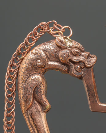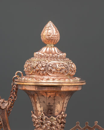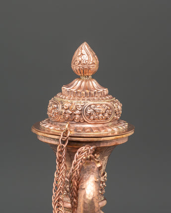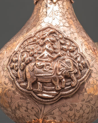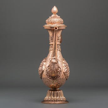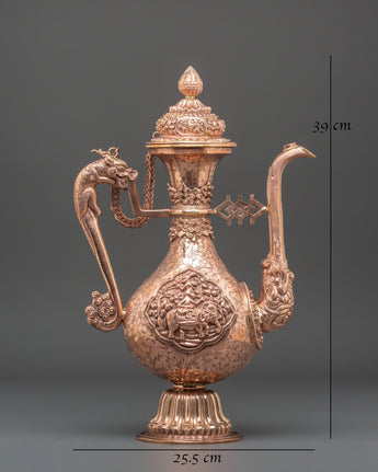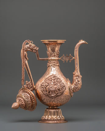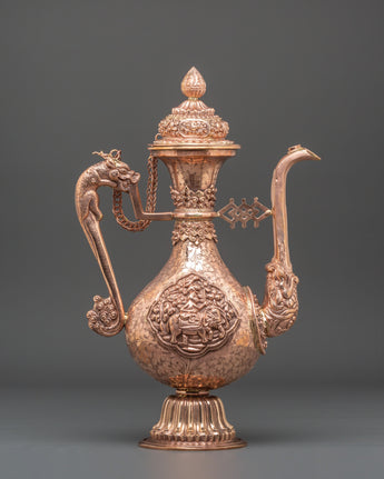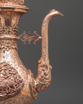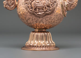 Every detail of this Copper Ritual Bhumba demonstrates the commitment and skill of Himalayan craftspeople. The body is decorated with exquisite repoussé designs showing protective deities and fortunate symbols, each with a spiritual value. The tall spout and decorative lid, which are commonly featured in ceremonial containers, represent the pouring of blessings and the purification of harmful energy. In Tibetan rituals, lamas use the Bhumba to sprinkle sacred water during initiations and purification rites, symbolizing the flow of compassion and the transformative power of wisdom.