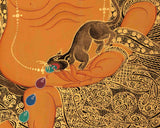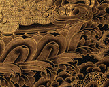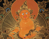 Our thangka shows the Dzambhala sitting on a lotus, holding a mongoose named Nehulay, which spews forth precious jewels and ornaments. This Painting is made up of Cotton Canvas, with 24k Gold to make the thangka beautiful.