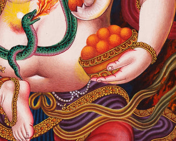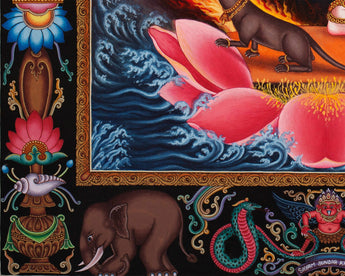 Our thangka is hand-painted with Pure 24 Carat Gold, Gouache, and acrylic colors on Cotton Canvas. The whole composition of the painting is very serene.