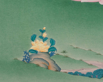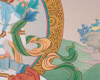 Invite a sense of divine calm into your space with this Goddess White Tara Giclee Canvas Print. This high-quality thangka reproduction captures the intricate artistry and sacred symbolism of the original piece. Printed on durable canvas with top-quality giclée techniques and available in your preferred size, this beautiful print captures the radiant essence of White Tara. It's not just a stunning piece to admire but also a meaningful aid for meditation, devotion, and inner reflection.