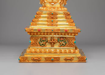 This Golden Copper Tibetan Stupa is a radiant symbol of enlightenment, offering, and spiritual protection in Tibetan Buddhism. Standing 52 cm tall and 26.5 cm wide, this stupa is crafted from a copper body with a rich gold-plated finish, making it an inspiring centerpiece for any meditation space or altar. Stupas are revered as sacred monuments that represent the Buddha's enlightened mind and the path to liberation, making this piece a powerful spiritual presence in your home.