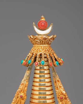 Perfect for placing on a Buddhist altar, meditation shrine, or sacred space, this Golden Stupa radiates peace, harmony, and protective blessings. Whether used for ritual offerings, as a meditation focus, or as an inspiring decor piece, it enhances spiritual practice and elevates the atmosphere with its warm, luminous presence. Its blend of gold plating, traditional copper craftsmanship, and symbolic coral and turquoise accents makes it an exceptional addition for practitioners and collectors of Tibetan Buddhist art.