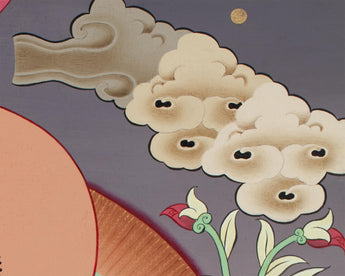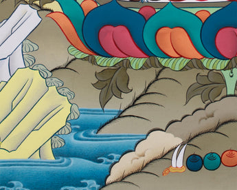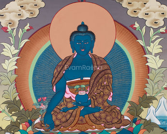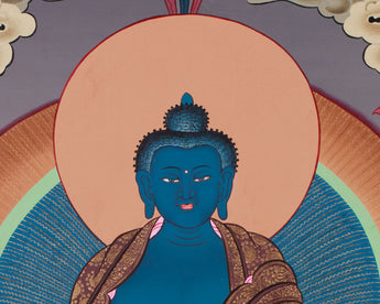 This thangka shows Bhaisajyaguru seated on a lotus throne with a deep blue body radiating healing light. His right hand holds a myrobalan (a medicinal plant), and his left hand holds a bowl of healing nectar, symbolizing purification. Golden accents highlight his serene yet powerful presence, transforming negative energy into healing. Sacred elements, such as lotus flowers and medicinal herbs, surround him, underscoring his role as a healer. Invite this Blue Buddha Thangka into your space to fill it with his divine healing energy of peace, protection, and well-being.