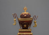 The kapala set is beautifully hand carved and plated with gold. The top holds the vajra and beautifully carved, the knot of eternity representing the intertwining of wisdom and compassion, the perfection of knowledge. The middle carved with the skull head as is represented as skull cup. And the bottom carved with elegant patterns.
