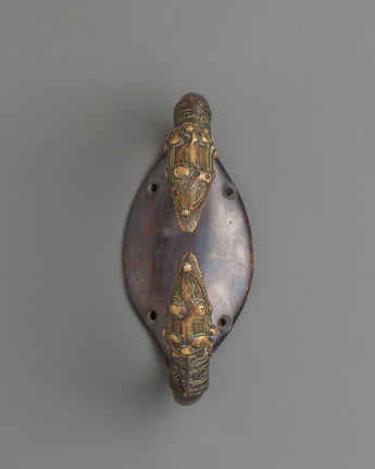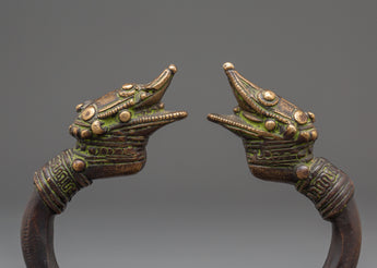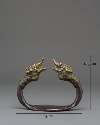 This handcrafted brass makara door handle showcases the artistry of Himalayan metalwork, featuring mirror-symmetrical dragonhead terminals. Measuring 14 centimeters in width and 10.5 centimeters in height, and weighing 0.61 kilograms, it features intricately detailed dragon heads that emerge from banded necks with open mouths symbolizing strength and protection. In Buddhist and Hindu mythology, the makara, a legendary aquatic creature, represents auspicious energy and guardianship, making it a meaningful motif in temple and palace design. The finely detailed scales, flowing manes, and crowned tops reflect generations of skilled craftsmanship, while the warm brass tones highlight the graceful curve that connects the two guardian figures.
