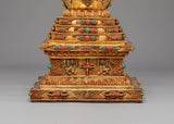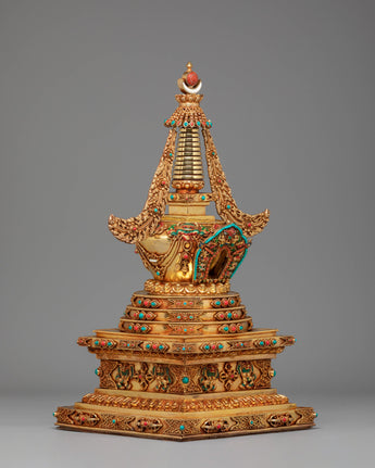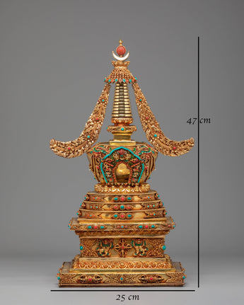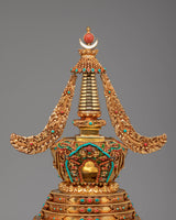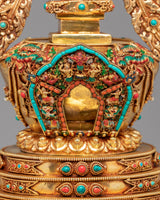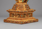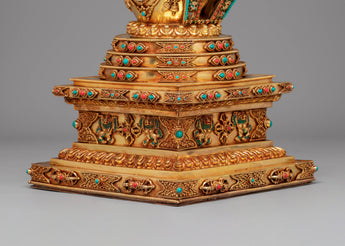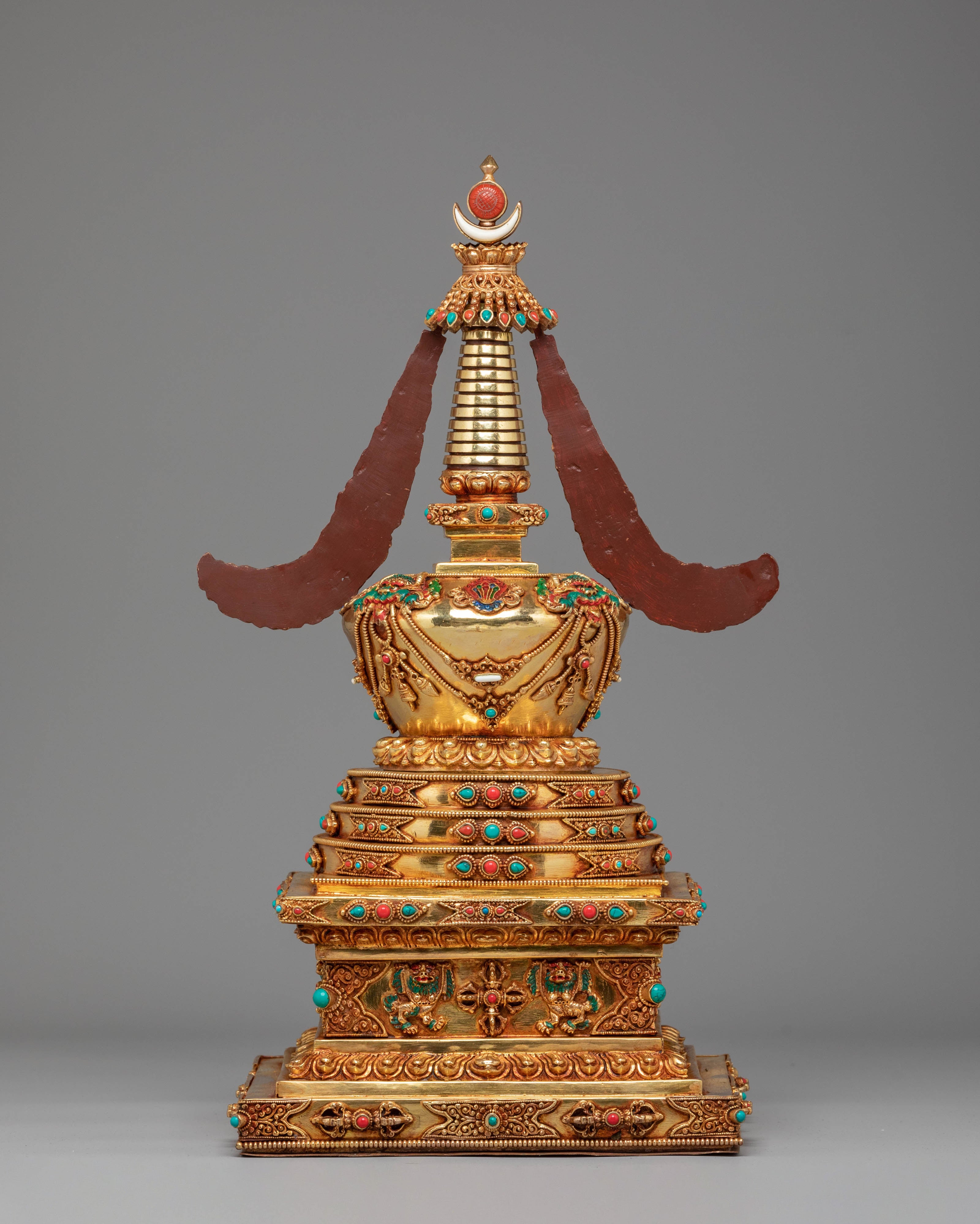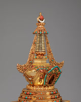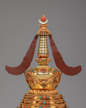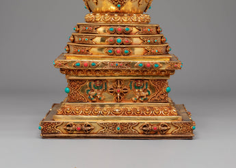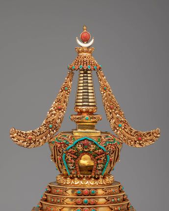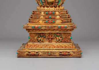 The stupa's intricate design includes decorative motifs and vibrant artificial stones—coral and turquoise—carefully placed around the structure to enhance its symbolic meaning. Coral represents , protection, and life force, while turquoise embodies healing, peace, and spiritual well-being. The fire gold-plated surface adds to the stupa's sacred aura, creating a luminous object of devotion that symbolizes the union of wisdom and compassion. The multi-tiered base and delicate carvings on the upper sections further represent the layers of the path to enlightenment, making this stupa a powerful tool for meditation, offerings, and spiritual practices.