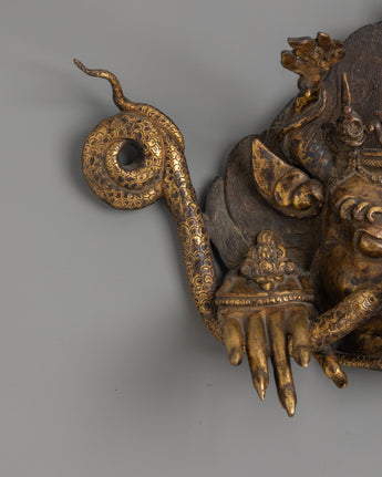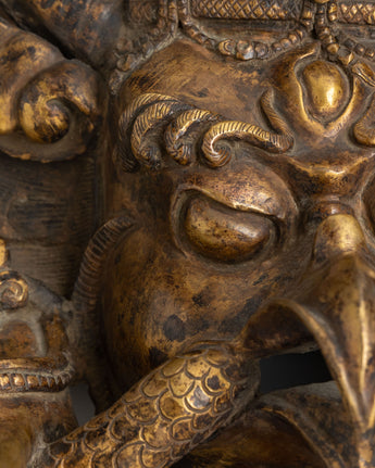 This sculpture is exquisitely detailed, depicting Garuda with spread arms and serpentine elements wrapped about him, symbolizing his ability to tame negative energies and protect against harm. His fierce countenance, extravagant crown, and intricate designs demonstrate the accuracy of Nepalese artisans who have continued the traditional metalworking traditions. The brass body's golden hue gives it an antique aura, while the layered textures add to the deity's feeling of motion and divinity.