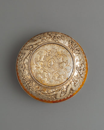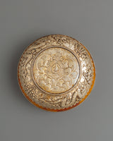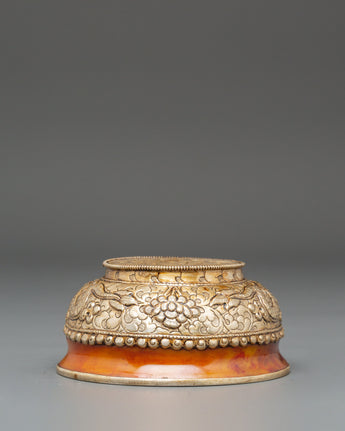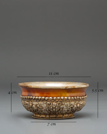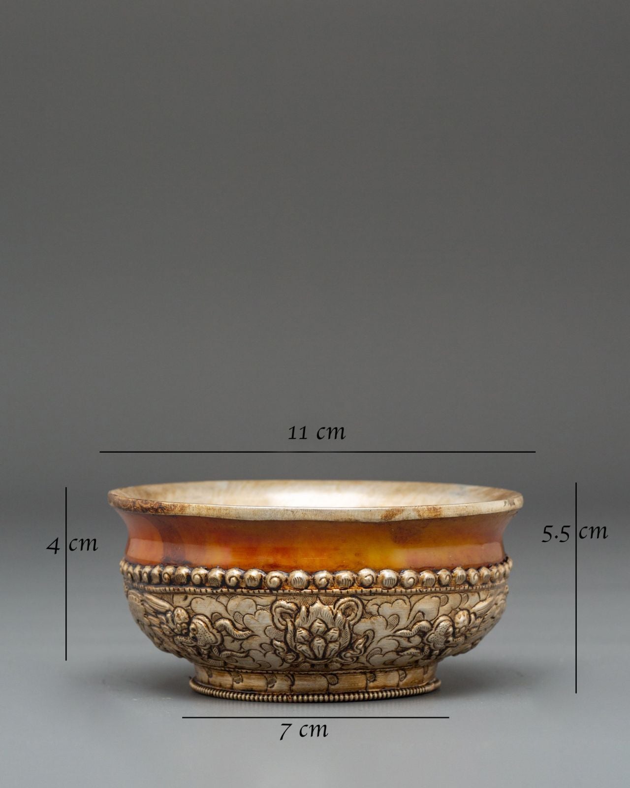 This Handmade Offering Bowl for Ceremonies is a precious item of Tibetan craftsmanship that represents commitment, reverence, and mindful offering. This ceremonial bowl is elegantly constructed from amber and white metal and measures 5.5cm in height, 11cm in circumference, 7cm in base, and 4cm in inner depth, weighing 0.23kg. Traditionally employed in Buddhist ceremonies, such offering bowls hold water, rice, or flowers, representing charity and the cultivation of merit through spiritual practice. Its luminous amber tone, combined with silver-white ornamentation, exudes peace and purity, making it ideal for altar offerings or meditation areas.