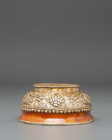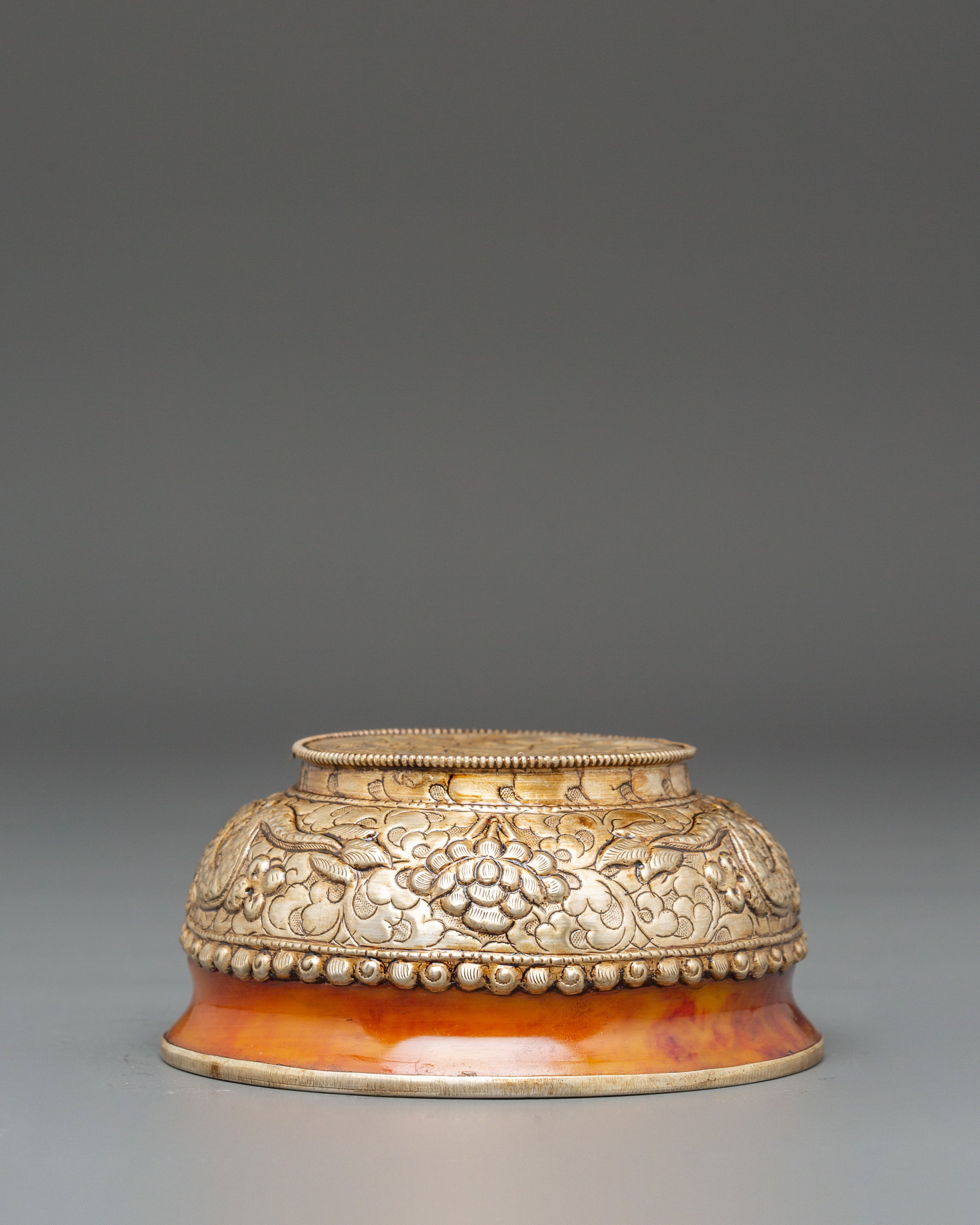The complex floral and lotus decorations around the base embody Tibetan artistic iconography, with each petal representing purity, spiritual awakening, and liberation from ignorance. The raised metalwork, with exquisite beaded edges, adds depth and richness to the design, demonstrating the artisan's skill and dedication. The warm amber color reflects the energy of life and devotion, and white metal indicates purity and spiritual clarity. They work together to create a balanced aesthetic — a marriage of earth and spirit — that infuses each event with beauty and profound meaning.