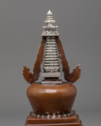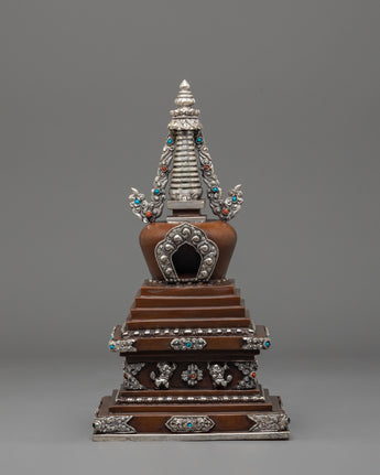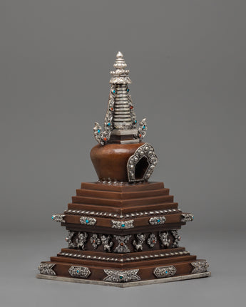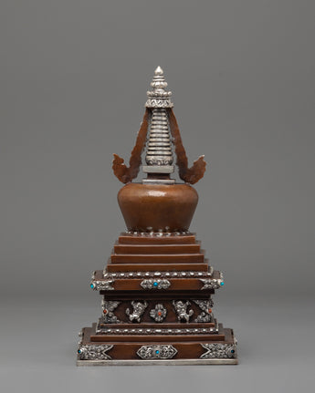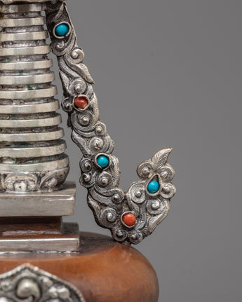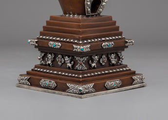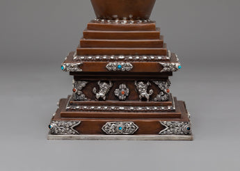 Every aspect of this Oxidized Copper Himalayan Ritual Stupa is imbued with spiritual meaning and expert craftsmanship. The square base symbolizes solidity and the physical world, whilst the dome represents the universe. The spire, which rises upward, represents the connection between human consciousness and enlightenment. The silver-plated accents and turquoise and coral stones highlight its mystical presence, boosting its spiritual vitality. The delicate carvings reveal the passion, expertise, and spiritual depth of traditional Himalayan artists, creating a sculpture that is both beautiful and meaningful.