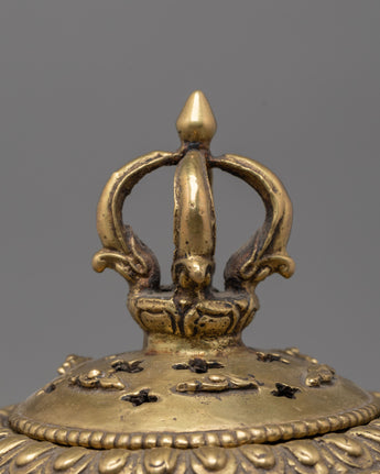 The Brass Incense Burner with Stand is a magnificent display of traditional workmanship and spiritual symbolism. This incense holder is handcrafted from brass and features a finely detailed bowl and an intricate lid adorned with a Vajra motif, which represents spiritual force and enlightenment. Its beautiful shape and delicate carvings capture the craftsmanship and commitment of Himalayan metallurgy, making it an ideal complement to any Buddhist altar, meditation room, or spiritual home decor.