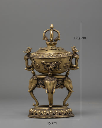 Three wonderfully sculpted elephant statues support the stand and represent power, wisdom, and stability, all of which are key values in both Buddhist and Hindu traditions. The sides of the censer have exquisite floral engravings and dragon images that reflect change and the purity of one's ideals. The perforated lid lets incense smoke rise smoothly, infusing your room with a relaxing aroma that promotes spiritual focus and mindfulness activities.