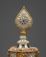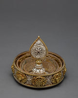 Our Ornate Mandala set is made of full silver and plated with pure gold. This particular set comes without the stand and the circular rings have beautiful hand carvings of Buddhist symbols of prosperity and auspiciousness. This gold-plated Mandala will be valuable to your Buddhist altar offering.