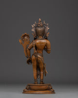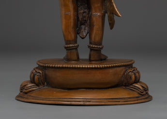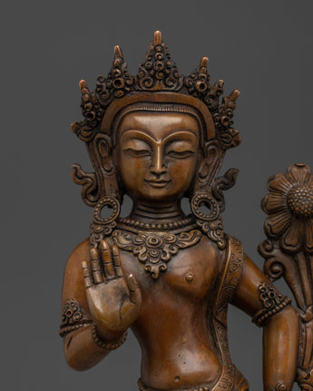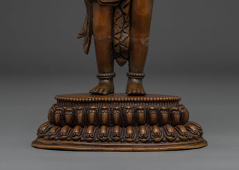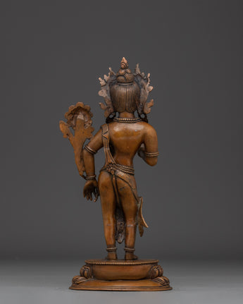 Padmapani is depicted in a graceful standing posture atop a detailed lotus base, symbolizing spiritual purity and the blossoming of compassion in the world. His right hand is raised in the abhaya mudra, a gesture of fearlessness and protection that offers reassurance and divine support to all beings. In his left hand, he holds the stem of a lotus flower that blooms beside his shoulder, representing purity, enlightenment, and the bodhisattva’s unwavering compassion. Adorning his head is a five-pointed crown, symbolizing the Five Dhyani Buddhas and the integration of their enlightened qualities. The oxidized copper finish enhances the serene and timeless presence of this compassionate figure.