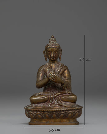 This Oxidized Copper Statue of Vairocana stands 8.5cm tall and 6cm wide, weighing 0.16kg, offering both beauty and meaning. Crafted from oxidized copper, this statue depicts Vairocana Buddha in a serene, peaceful manner, embodying the infinite wisdom and spiritual clarity he represents. The oxidized finish gives an antique appearance, highlighting its traditional craftsmanship.