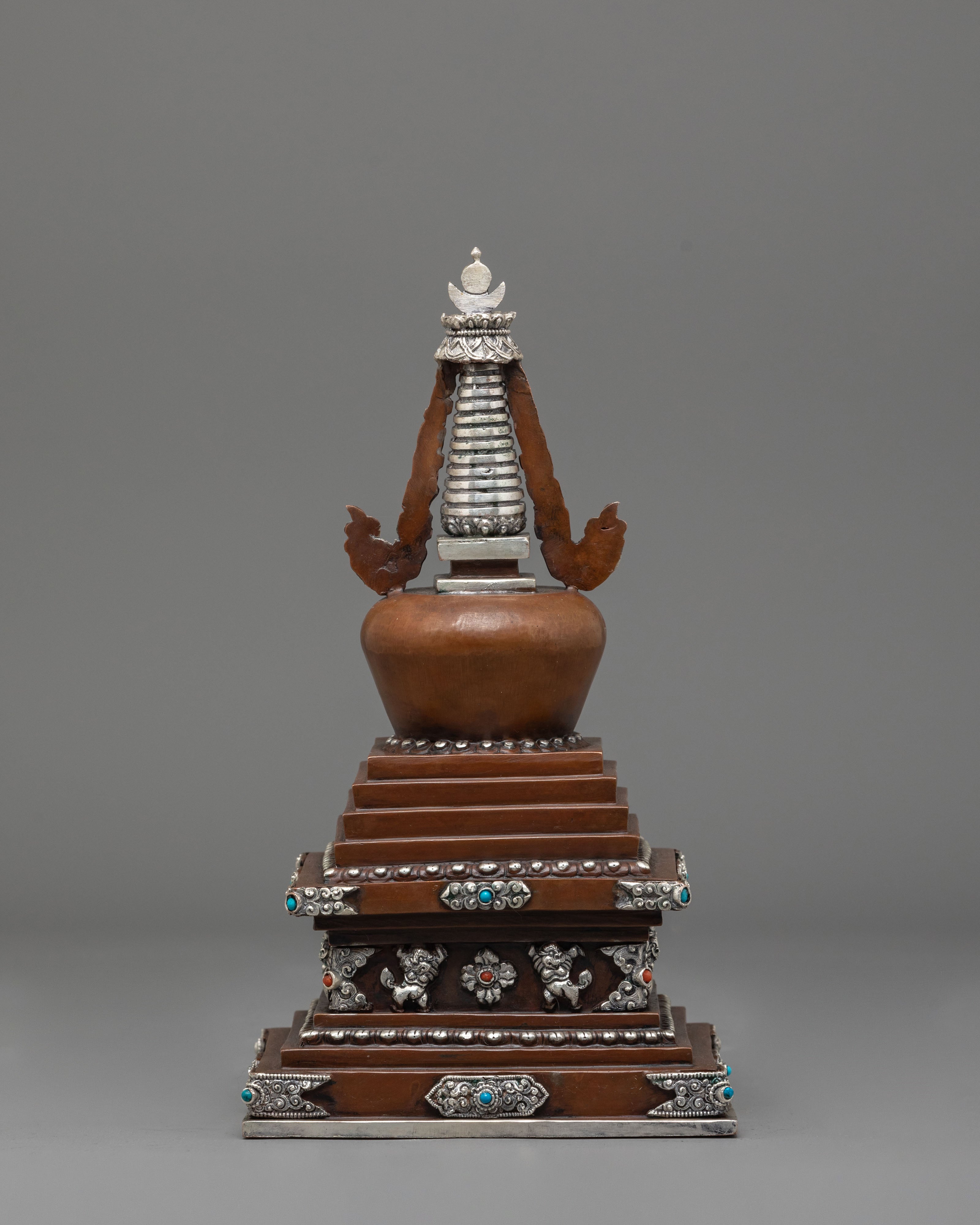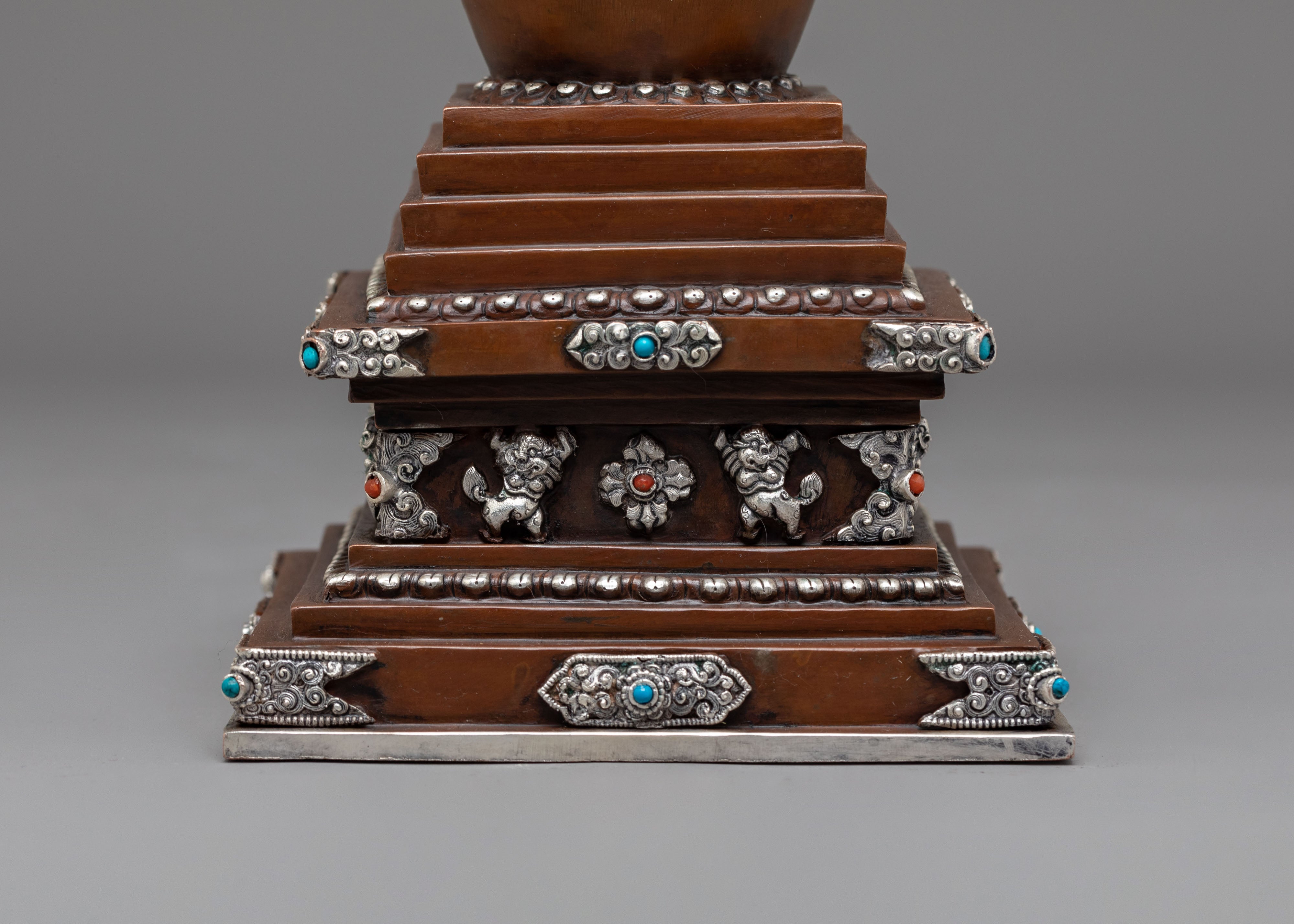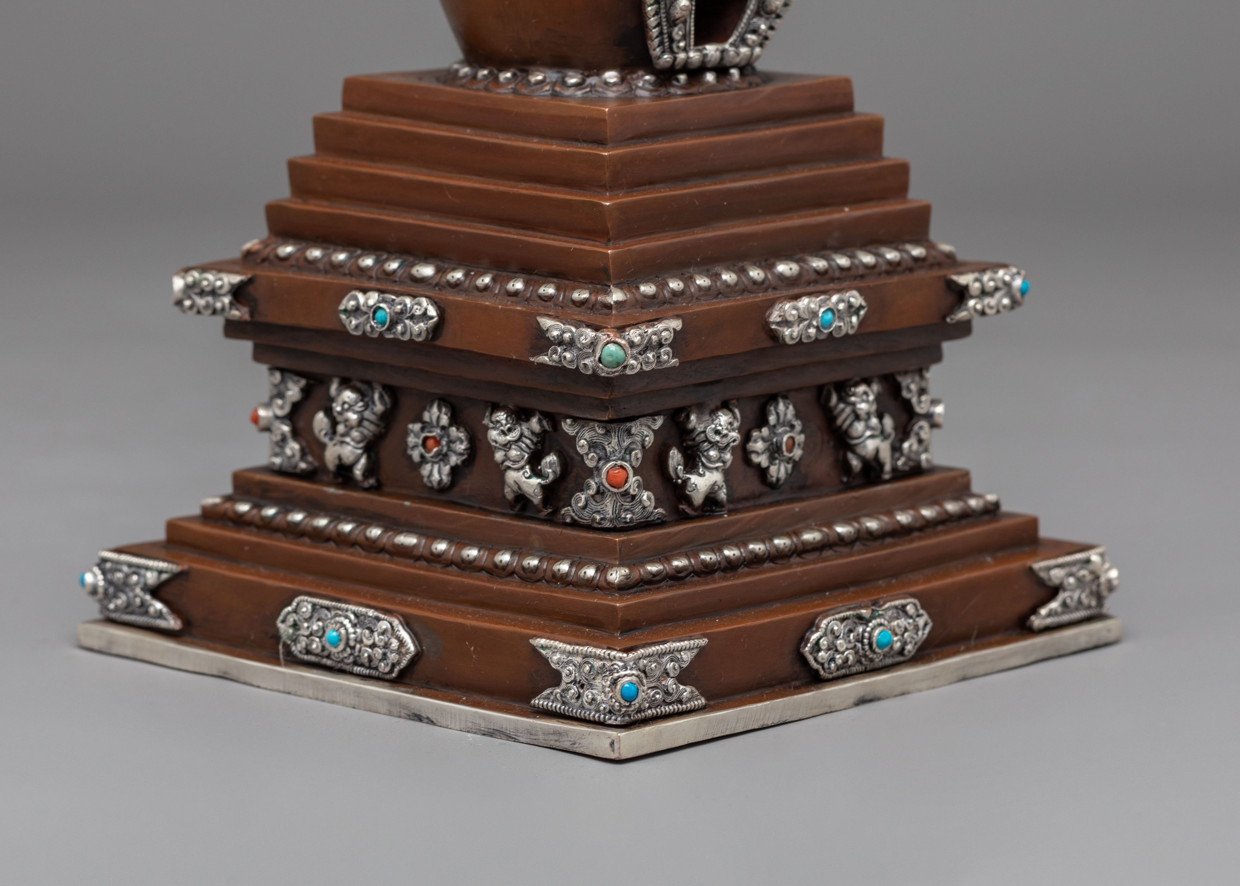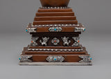 Oxidized Copper Stupa for Ceremonies | Buddhist Ritual Artifact with Coral and Turquoise Stone Inlays