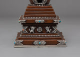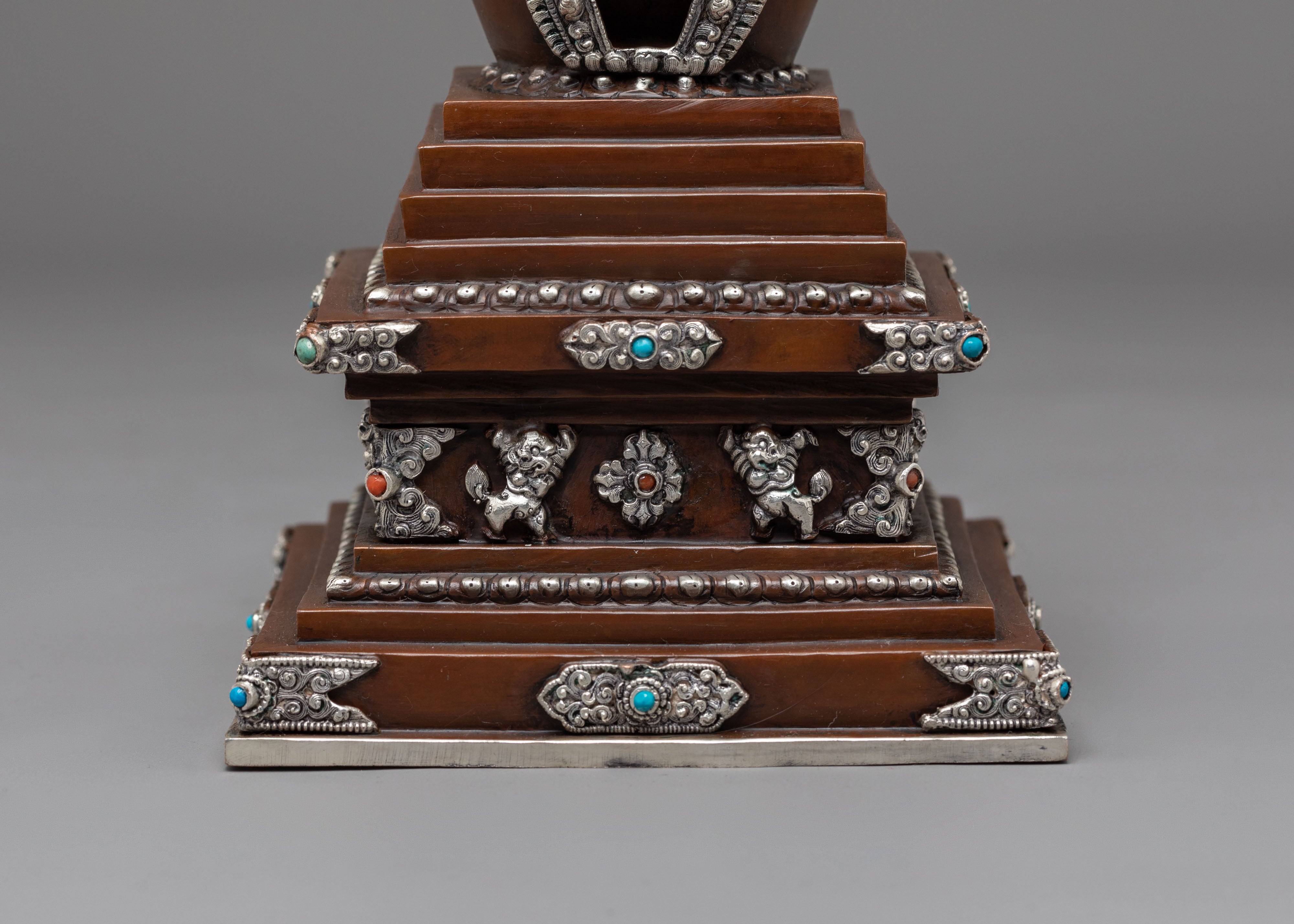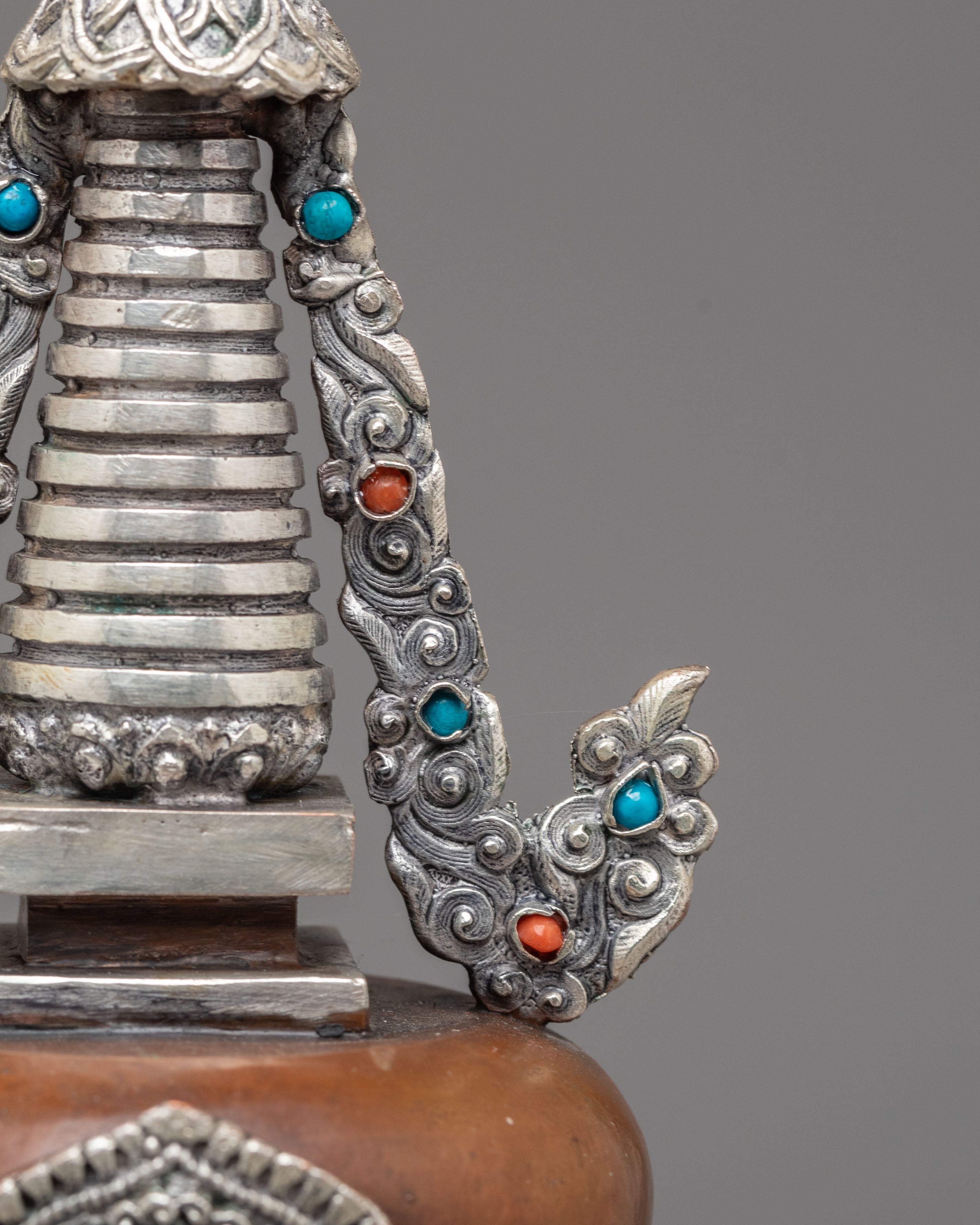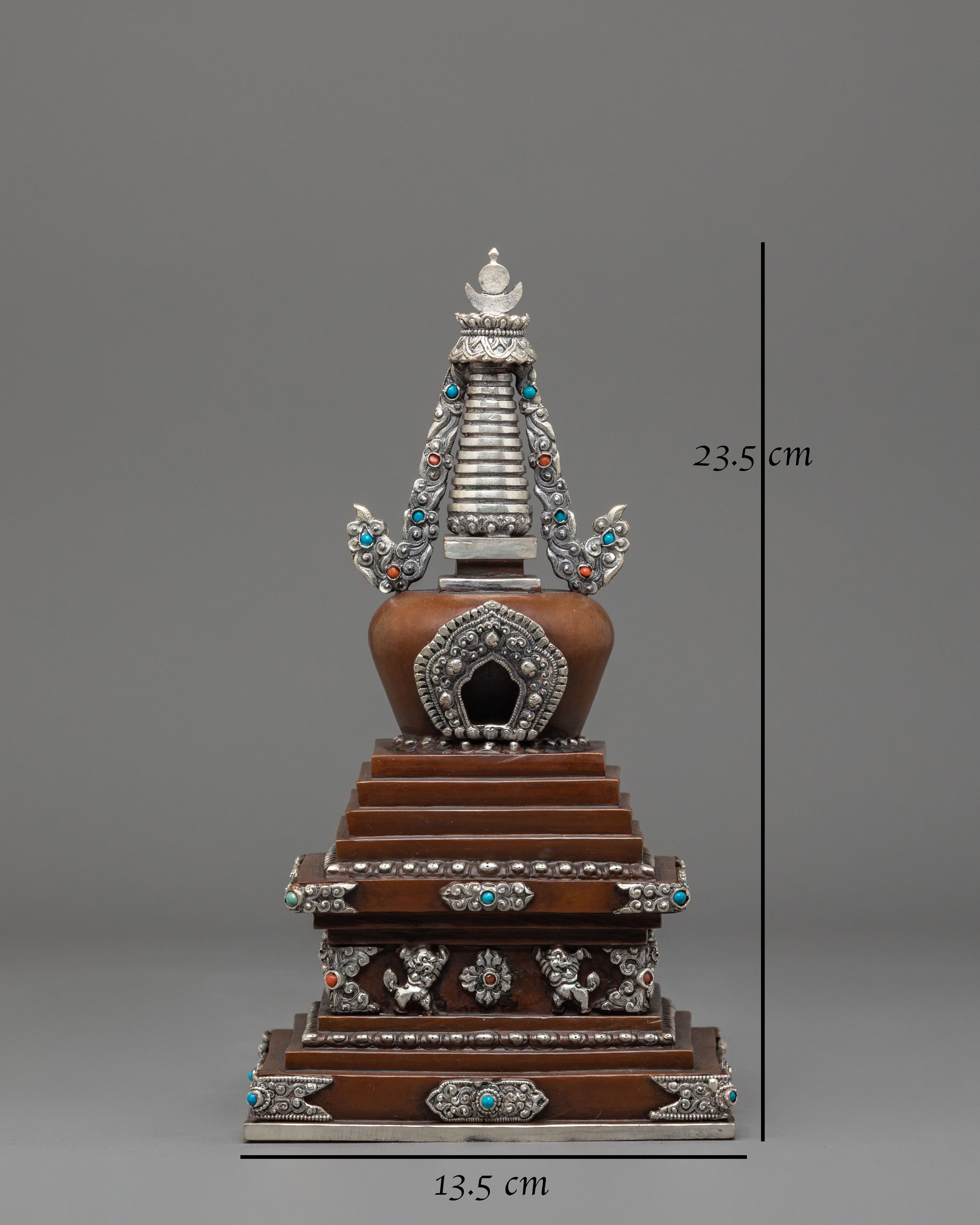Oxidized Copper Stupa for Ceremonies | Buddhist Ritual Artifact with Coral and Turquoise Stone Inlays