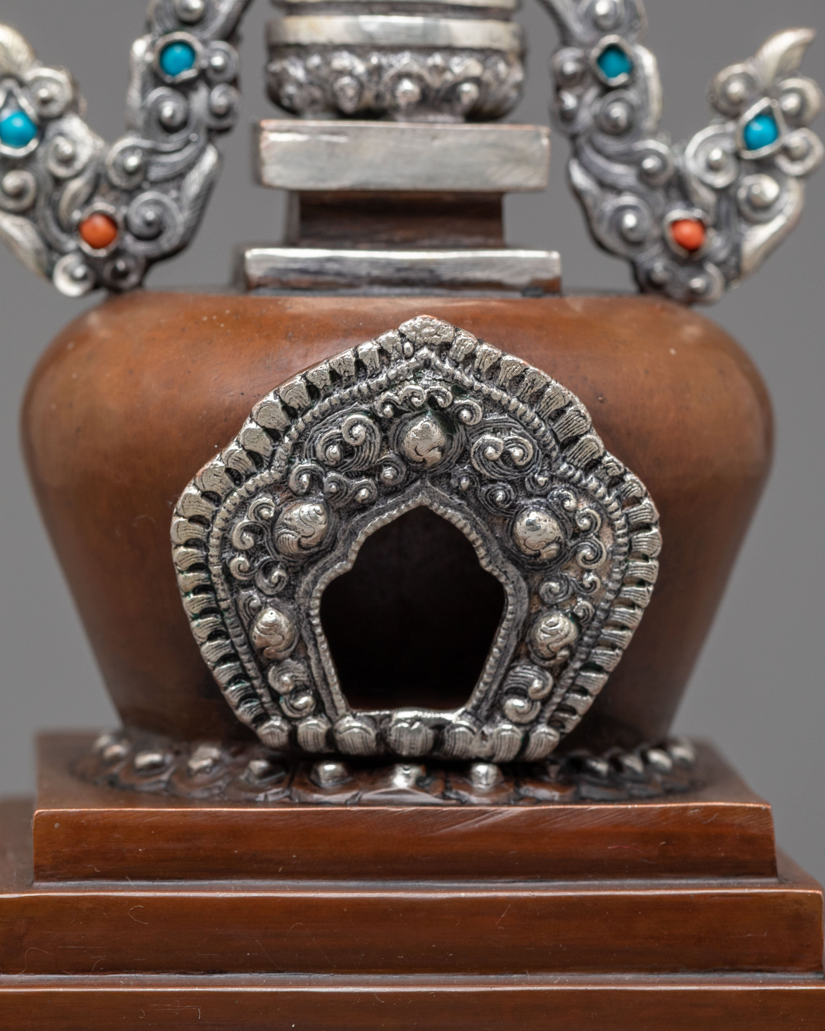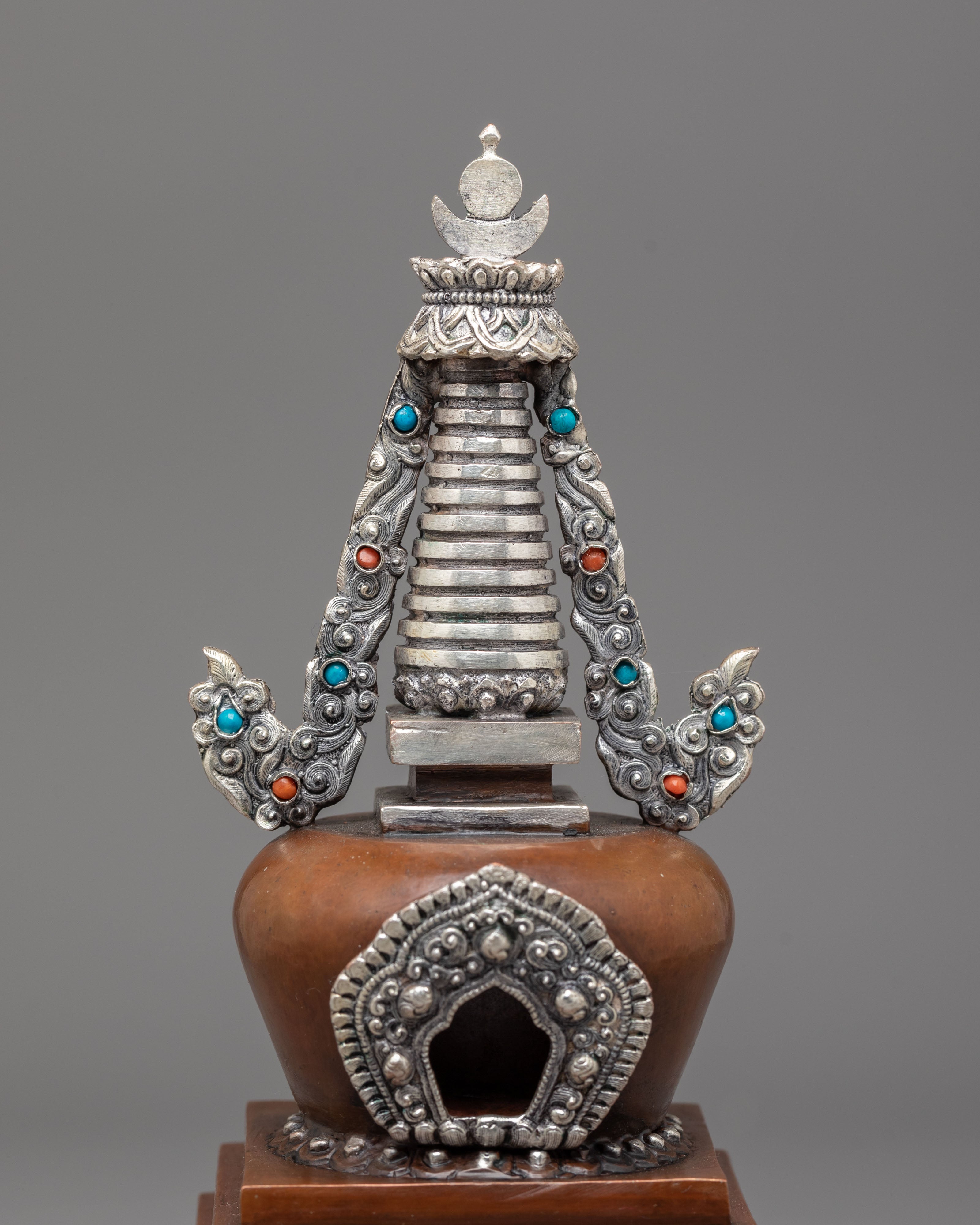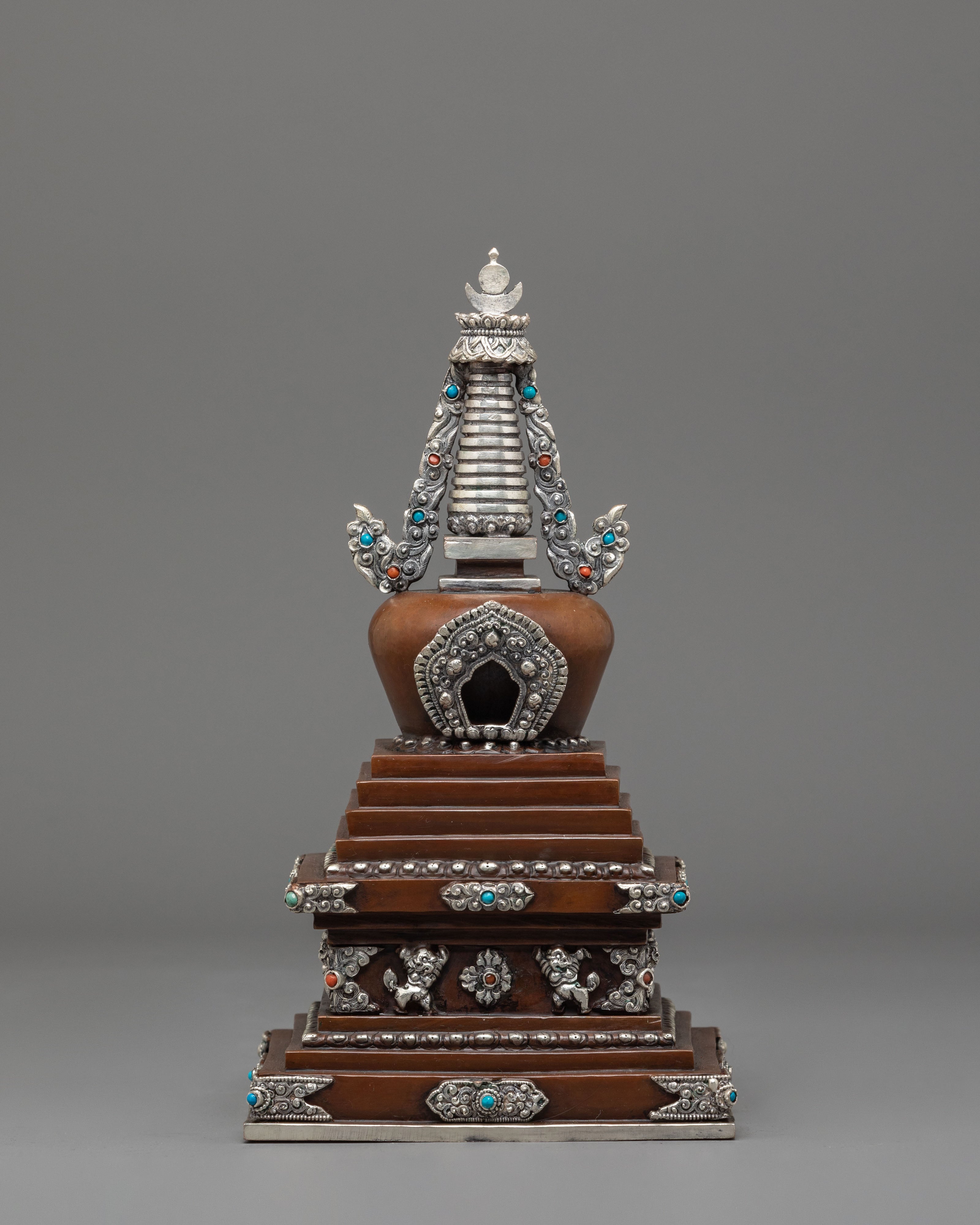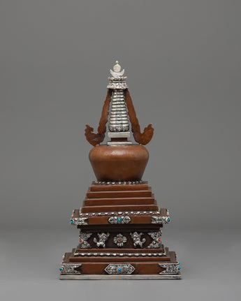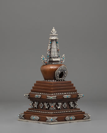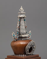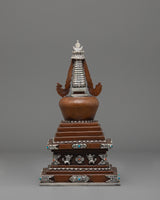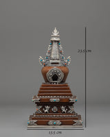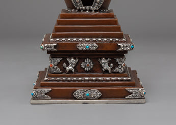 This stupa comes to life through exquisite craftsmanship, including precise carving and religious adornment. The base is tiered in ascending layers to represent the stages of enlightenment, while the body is adorned with auspicious motifs and silver filigree. The jewelry is embellished with imitation turquoise and coral stones, reflecting a balance of spiritual and earthly aspects. The upper half is crowned with a moon-and-sun emblem that represents Buddhist philosophy's unity and completeness. Every part of the design is of profound importance, serving as a meditative reminder of wisdom, purity, and compassion.