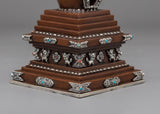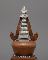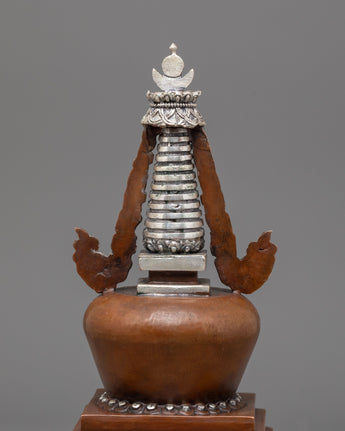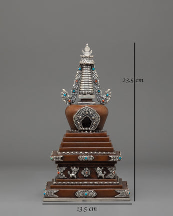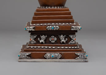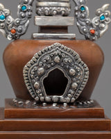 This Oxidized Copper Stupa for Ceremonies is a sacred emblem of enlightenment and spiritual rebirth, meticulously made by talented Himalayan artisans. This ceremonial stupa (or Chorten), made of oxidized copper with silver-plated embellishments, symbolizes the Buddha's enlightened mind and the way to ultimate nirvana. Stupas, often placed atop Buddhist altars, are potent offerings that radiate peace, harmony, and positive energy throughout their surroundings.
