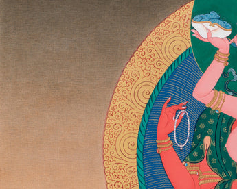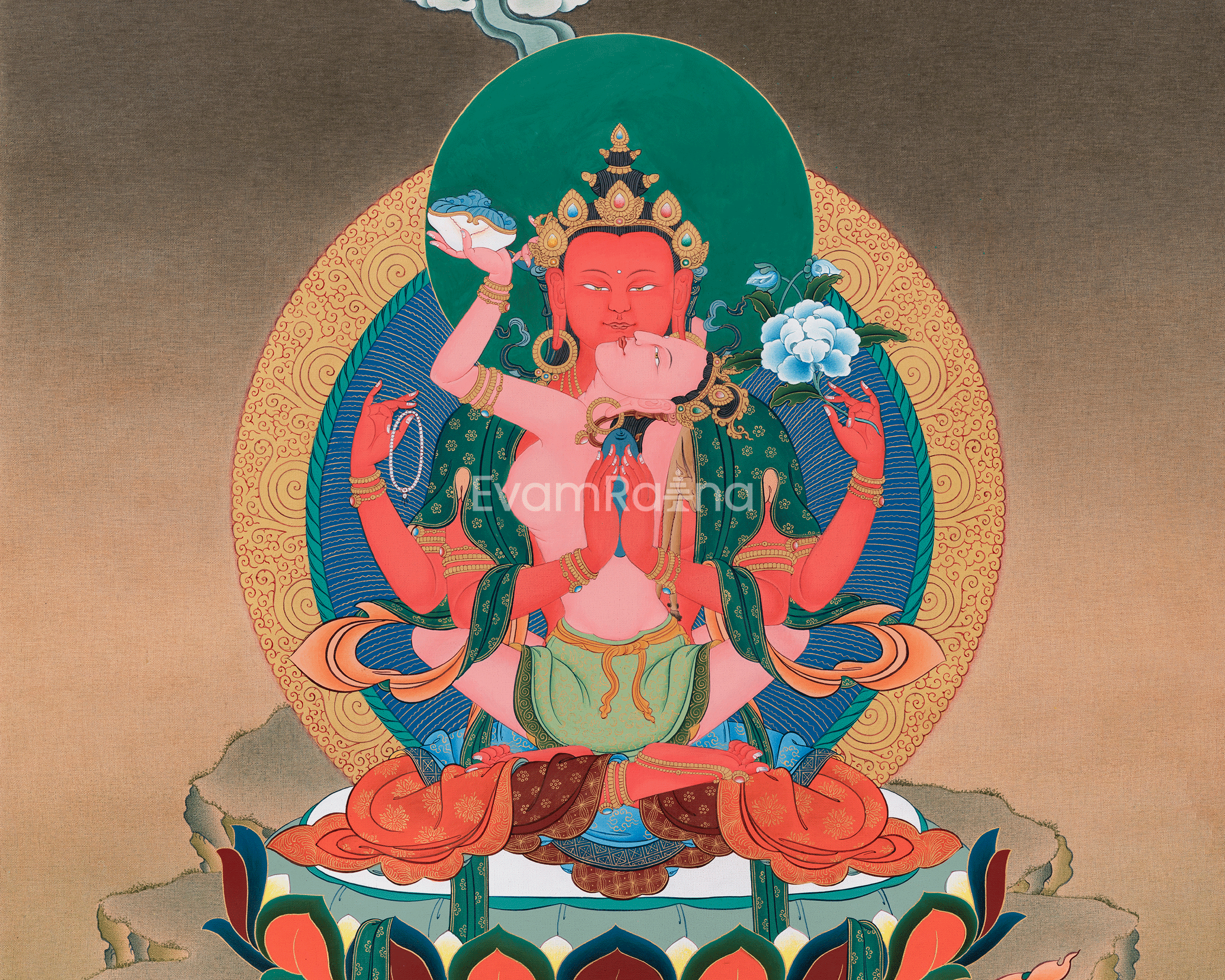 In this thangka print, he appears in his four-armed form: his front hands are joined in prayer, holding a wish-fulfilling jewel, symbolizing his vow to bless all beings. His upper right hand holds a crystal mala, representing ongoing compassion through mantra recitation, while his upper left hand holds a lotus flower, signifying purity and liberation. Seated in union with his consort, she has a skull cup in her right hand, and her other arm encircles him from behind, embodying the inseparability of wisdom and compassion. Surrounded by a luminous halo and enthroned on a lotus, this Red Chenrezig Canvas Print is both a powerful visual meditation tool and a sacred work of art.