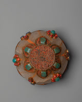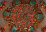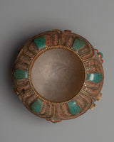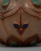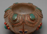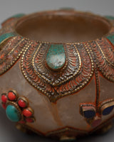 This Rice Bowl is entirely hand-carved; composed of crystal, copper alloy with delicate complex filigree hand carvings called as siko carvings in local word, it is gold plated and embellished with Coral, Turquoise, Lapis, and Crystal Stones to produce a rich and sensual finish. The Rice Bowl is adorned with magnificent carvings created from various stones, giving it a great appearance and style.