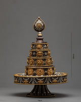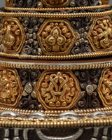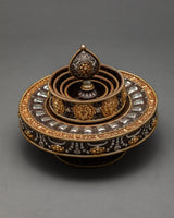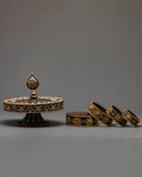 The traditional mandala is appreciated as artwork for its elegance and naturally balanced nature of the outer world and the inner mind. This Mandala Set is made of copper silver and is delightfully hand-carved with lovely Ashthamangala carvings.