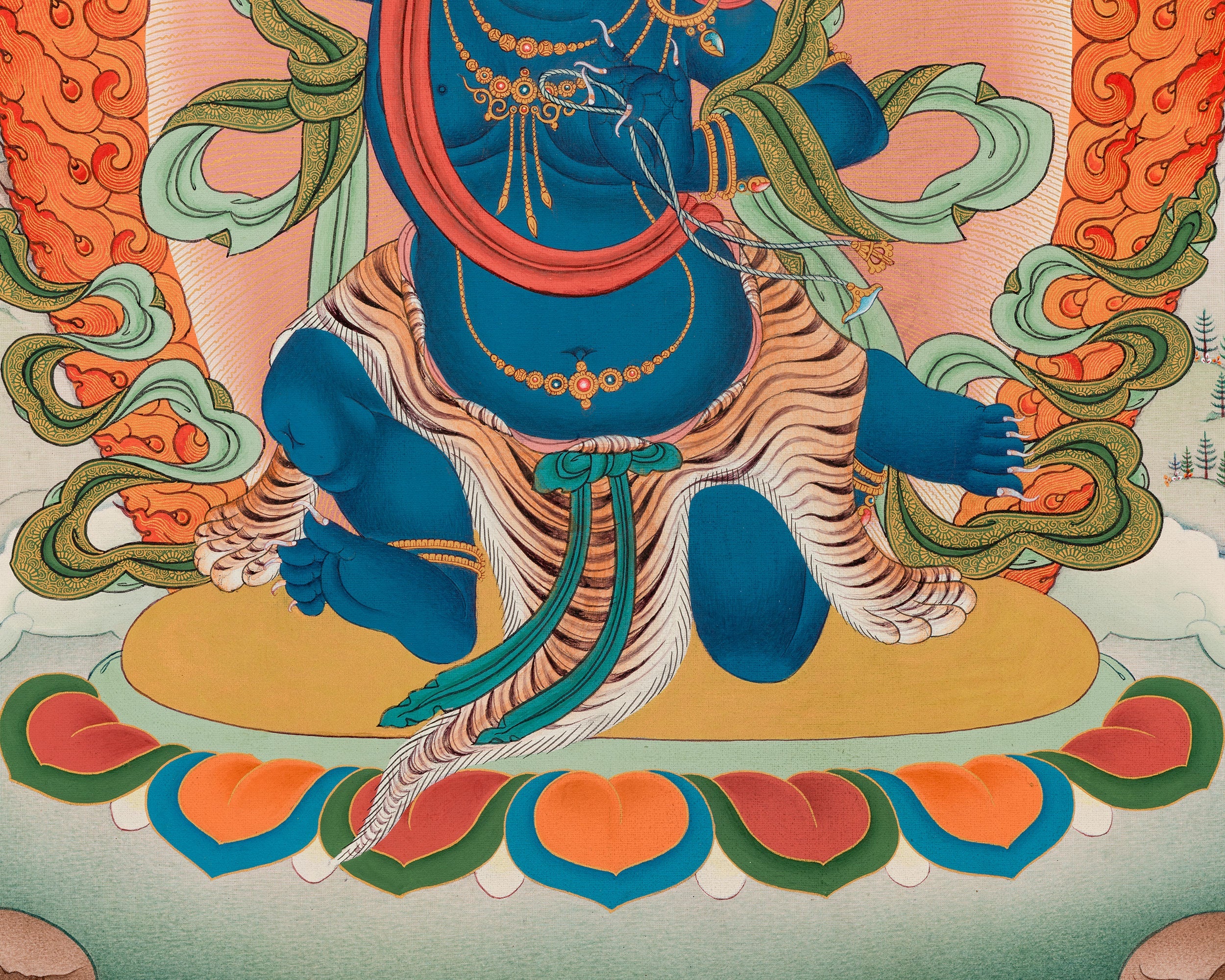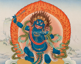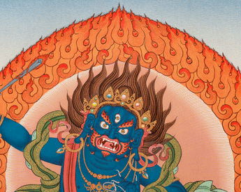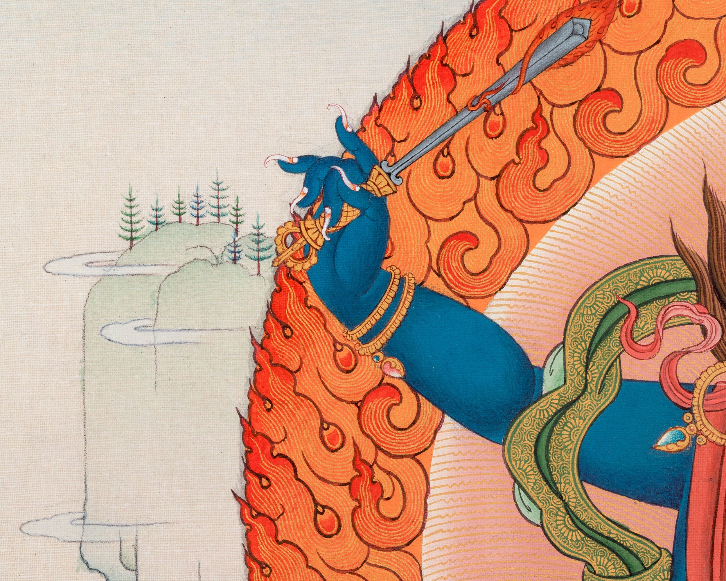 Our high-quality Acala Canvas Print offers a breathtaking reproduction of the original thangka, brilliantly showcasing its vibrant colors, striking imagery, and intricate details. Printed on durable canvas and available in a variety of sizes, it brings the sacred energy of Acala into your meditation space, altar, or home decor. Serving not just as devotional art, thangka prints like this one act as powerful tools for visualization and practice, making them highly coveted by both practitioners and collectors. With their role as guardians against obstacles and negativity, they add a meaningful touch to any environment.