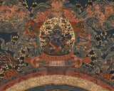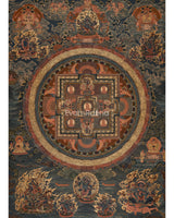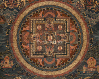 At the center of this Sacred Buddha Mandala, the Buddha sits peacefully within the cosmic circle, symbolizing enlightenment as the foundation of harmony. Around him are highly detailed deities, each representing different facets of compassion, wisdom, and protection. The mandala's symmetrical design reflects the universe—a sacred map guiding viewers toward inner tranquility and awakening. Every element, from the radiating lotus petals to the outer protective rings, holds deep symbolic significance, transforming this thangka into not just a visual masterpiece but also a meditative tool for spiritual reflection.