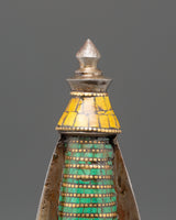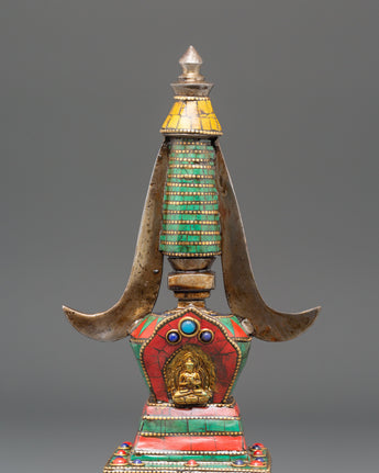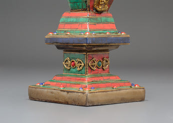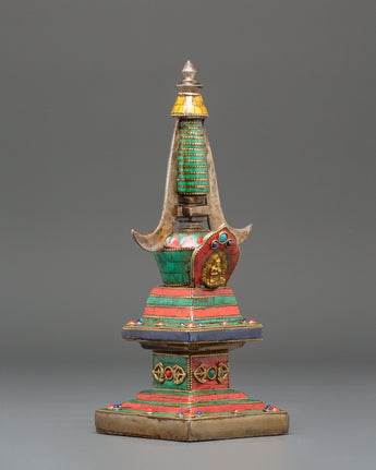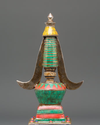 Every detail of this stupa demonstrates the commitment and artistry of Himalayan artists. The Sacred Himalayan Stupa serves as a spiritual reminder of the journey to enlightenment, instilling peace and sacred energy in its surroundings. The use of iron and inlaid stones reflects the relationship between strength and compassion, anchoring your altar or home in tranquil awareness. This Sacred Himalayan Stupa, whether put in a personal shrine, yoga studio, or as part of a Buddhist art collection, brings the blessings of peace, knowledge, and inner transformation into your area.