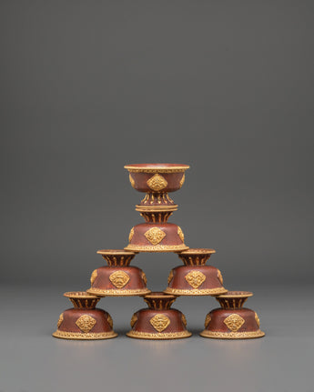 This Spiritual Altar Offering Set is a sacred representation of Himalayan devotion and artistry, handcrafted from copper, intricately gold-plated, and finished with rich acrylic coloring. The set includes seven bowls, traditionally symbolizing the seven offerings made on Buddhist altars — water for drinking, water for washing, flowers, incense, light, perfume, and food. Each offering bowl stands as a vessel of purity and gratitude, embodying the spiritual practice of generosity and mindfulness that lies at the heart of Buddhist rituals.